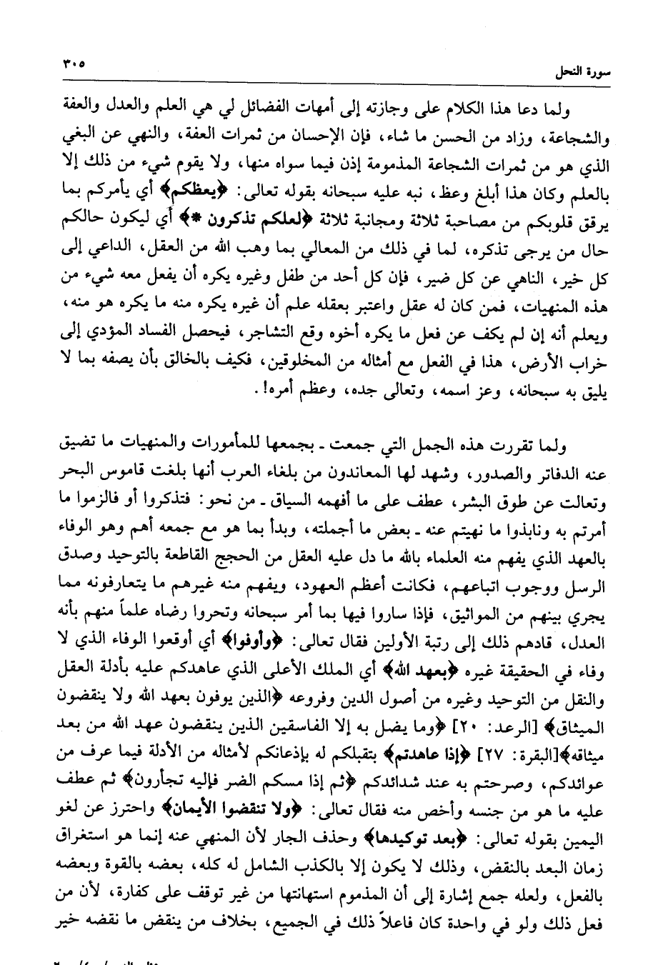 ولما دعا هذا الكلام على وجازته إلى أمهات الفضائل لي هي العلم والعدل والعفة والشجاعة ، وزاد من الحسن ما شاء ، فإن الإحسان من ثمرات العفة ، والنهي عن البغي الذي هو من ثمرات الشجاعة المذمومة إذن فيما سواه منها ، ولا يقوم شيء من ذلك إلا بالعلم وكان هذا أبلغ وعظ ، نبه عليه سبحانه بقوله تعالى : ( يعظكم ) أي يأمركم بما يرقق قلوبكم من مصاحبة ثلاثة ومجانبة ثلاثة ) لعلكم تذكرون ) أي ليكون حالكم حال من يرجى تذكره ، لما في ذلك من المعالي بما وهب الله من العقل ، الداعي إلى كل خير ، الناهي عن كل ضير ، فإن كل أحد من طفل وغيره يكره أن يفعل معه شيء من هذه المنهيات ، فمن كان له عقل واعتبر بعقله علم أن غيره يكره منه ما يكره هو منه ، ويعلم أنه إن لم يكف عن فعل ما يكره أخوه وقع التشاجر ، فيحصل الفساد المؤدي إلى خراب الأرض ، هذا في الفعل مع أمثاله من المخلوقين ، فكيف بالخالق بأن يصفه بما لا يليق به سبحانه ، وعز اسمه ، وتعالى جده ، وعظم أمره .