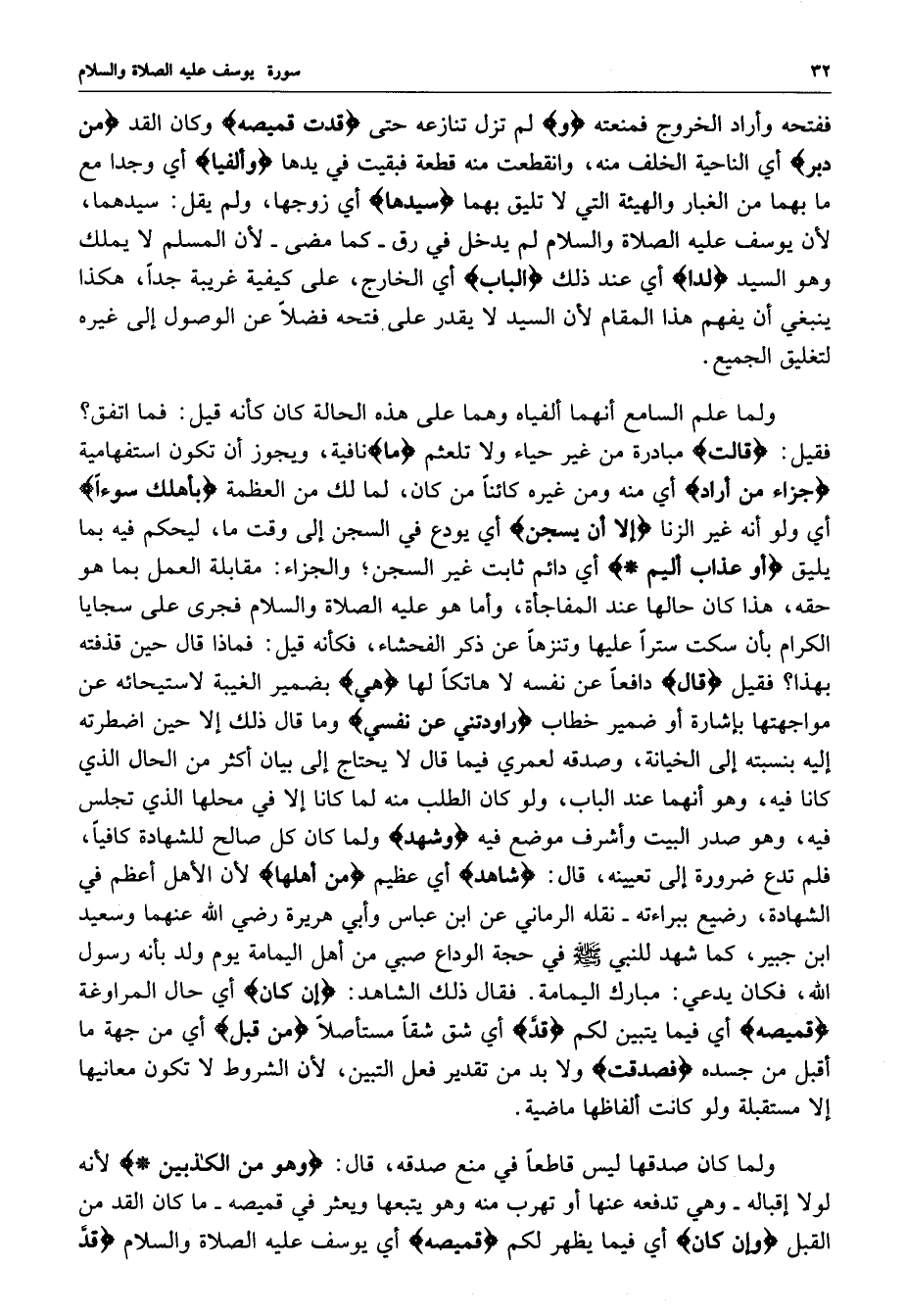 ولما علم السامع أنهما ألفياه وهما على هذاه الحالة كان كأنه قيل : فما اتفق ؟ فقيل : ( قالت ( مبادرة من غير حياء ولا تلعثم ) ما ( نافية ، ويجوز أن تكون استفهامية ) جزاء من أراد ) أي منه ومن غيره كائناً من كان ، لما لك من العظمة ) بأهلك سوءاً ) أي ولو أنه غير الزنا ) إلا أن يسجن ) أي يودع في السجن إلى وقت ما ، ليحكم فيه بما يليق ) أو عذاب أليم ) أي دائم ثابت غير السجن ؛ والجزاء : مقابلة العمل بما هو حقه ، هذا كان حالها عند المفاجأة ، وأما هو عليه الصلاة والسلام فجرى على سجايا الكرام بأن سكت ستراً عليها وتنزهاً عن ذكر الفحشاء ، فكأنه قيل : فماذا قال حين قذفته بهذا ؟ فقيل ) قال ( دافعاً عن نفسه لا هاتكاً لها ) هي ( بضمير الغيبة لاستيحائه عن مواجهتها بإشارة أو ضمير خطاب ) راودتني عن نفسي ( وما قال ذلك إلا حين اضطرته إليه بنسبته إلى الخيانة ، وصدقه لعمري فيما قال لا يحتاج إلى بيان أكثر من الحال الذي كانا فيه ، وهو أنهما عند الباب ، ولو كان الطلب منه لما كانا إلا في محلها الذي تجلس فيه ، وهو صدر البيت وأشرف موضع فيه ) وشهد ( ولما كان كل صالح للشهادة كافياً ، فلم تدع ضرورة إلى تعيينه ، قال : ( شاهد ) أي عظيم ) من أهلها ( لأن الأهل أعظم في الشهادة ، رضيع براءته - نقله الرماني عن ابن عباس وأبي هريرة رضي الله عنهما وسعيد ابن جبير ، كما شهد للنبي ( صلى الله عليه وسلم ) في حجة الوداع صبي من أهل اليمامة يوم ولد بأنه رسول الله ، فكان يدعي : مبارك اليمامة .