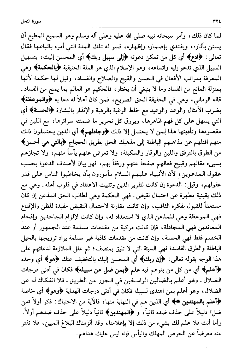 لما كان ذلك ، وأمر سبحانه نبيه صلى الله عليه وعلى آله وسلم وهو السميع المطيع أن يستن بآثاره ، ويقتدي بإضماره وإظهاره ، فسر له تلك الملة التي أمره باتاعها فقال تعالى : ( ادع ) أي كل من تمكن دعوته ) إلى سبيل ربك ) أي المحسن إليك ، بتسهيل السبيل الذي تدعو إليه واتساعه ، وهو الإسلام الذي هو الملة الحنيفية ) بالحكمة ( وهي المعرفة بمراتب الأفعال في الحسن والقبح والصلاح والفساد ، وقيل لها حكمة لأنها بمنزلة المانع من الفساد وما لا ينبغي أن يختار ، فالحكيم هو العالم بما يمنع من الفساد - قاله الرماني ، وهي في الحقيقة الحق الصريح ، فمن كان أهلاً له دعا به ) والموعظة ( بضرب الأمثال والوعد والوعيد مع خلط الرغبة بالرهبة والإنذار بالبشارة ) الحسنة ) أي التي يسهل على كل فهم ظاهرها ، ويروق كل نحرير ما ضمنته سرائرها ، مع اللين في مقصودها وتأديتها هذا لمن لا يحتمل إلا ذلك ) وجادلهم ) أي الذين يحتملون ذلك منهم افتلهم عن مذاهبهم الباطلة إلى مذهبك الحق بطريق الحجاج ) بالتي هي أحسن ( من الطرق بالترفق واللين والوقار والسكينة ، ولا تعرض عنهم يأساً منهم ، ولا تجازهم بسيئ مقالهم وقبيح فعالهم صفحاً عنهم ورفقاً بهم ، فهو بيان لأصناف الدعوة بحسب عقول المدعوين ، لأن الأنبياء عليهم السلام مأمورون بأن يخاطبوا الناس على قدر عقولهم ، وقيل : الدعوة إن كانت لتقرير الدين وتثبيت الإعتقاد في قلوب أهله - وهي مع ذلك يقينية مطهرة عن احتمال نقيض - فهي الحكمة وهي لطالب الحق المذعن غن كان مستعداً للقبول بفكرة الثاقب ، وإن كانت مقانة لاحتمال النقيض مفيدة للظن والإقناع فهي الموعظة وهي للمذعن الذي لا استعداد له ، وإن كانت لإلزام الجاحدين وإفحام المعاندين فهي المجادلة ، فإن كانت مركبة من مقدمات مسلمة عند الجمهور أو عند الخصم فقط فهي الحسنة ، وإن كانت من مقدمات كاذبة غير مسلمة يراد ترويجها بالحيل الباطلة والطرق الفاسدة فهي السيئة التي لا يليثق بمنصف ؛ ثم علل الملازمة لدعائهم على هذا الوجه بقوله تعالى : ( إن ربك ) أي المحسن إليك بالتخفيف عنك ) هو ) أي وحده ) أعلم ) أي من كل من يتوهم فيه علم ) بمن ضل عن سبيله ( فكان في أدنى درجات الضلال - وهو أعلم بالضالين الراسخين في الجور عن الطريق - فلا انفكاك له عن الضلال ، وهو أعلم بمن اهتدى لسبيله فكان في أدنى درجات الهداية ) وهو ) أي خاصة ) أعلم بالمهتدين ) أي الذين هم في النهاية منها ، فالآية من الاحتباك : ذكر أولاً ( من ضل ) دليلاً على حذف ضده ثانياً ، و ) المهتدين ( ثانياً دليلاً على حذف ضدهم أولاً .
