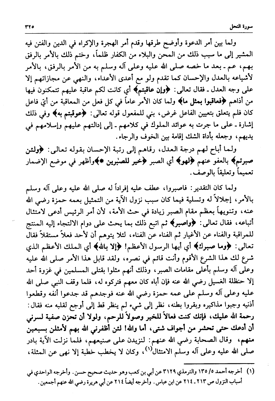 ولما كان التقدير : فاصبروا ، عطف عليه إفراداً له صلى الله عليه وعلى آله وسلم بالأمر ، إجلالاً له وتسلية فيما كان سبب نزول الآية من التمثيل بعمه حمزه رضي الله عنه ، وتنويهاً بعظم مقام الصبر زيادة في حث الأمة ، لأن أمر الرئيس أدعى لامتثال أتباعه ، فقال تعالى : ( واصبر ( ثم اتبع ذلك بما يحث على دوام الالتجاء إليه المنتج للمراقبة والفناء عن الأغيار ثم الفناء عن الفناء ، لئلا يتوهم أن لأحد فعلاً مستقلاً فقال تعالى : ( وما صبرك ) أي أيها الرسول الأعظم ) إلا بالله ) أي الملك الأعظم الذي شرع لك هذا الشرع الأقوم وأنت قائم في نصره ، ولقد قابل هذا الأمر صلى الله عليه وعلى آله وسلم بأعلى مقامات الصبر ، وذلك أنهم مثلوا بقتلى المسلمين في غزوة أحد إلا حنظلة الغسيل رضي الله عنه فإن أباه كان معهم فتركوه له ، فلما وقف النبي صلى الله عليه و على آله وسلم على عمه حمزة رضي الله عنه فوجدهم قد جدعوا أنفه وقطعوا أذنيه وجبوا مذاكيره وبقروا بطنه ، نظر إلى شيء لم ينظر قط إلى أوجع لقلبه منه فقال : ( رحمة الله عليك ، فإنك كنت فعالاً للخير وصولاً للرحم ، ولولا أن تحزن صفيه لسرني أن أدعك حتى تحشر من أجواف شتى ، أما والله لئن أظفرني الله بهم لأمثلن بسبعين منهم ، ) وقال الصحابة رضي الله عنهم : لنزيدن على صنيعهم ، فلما نزلت الآية بادر ( صلى الله عليه وسلم ) الامتثال ، وكان لا يخطب خطبة إلا نهى عن المثلة ،