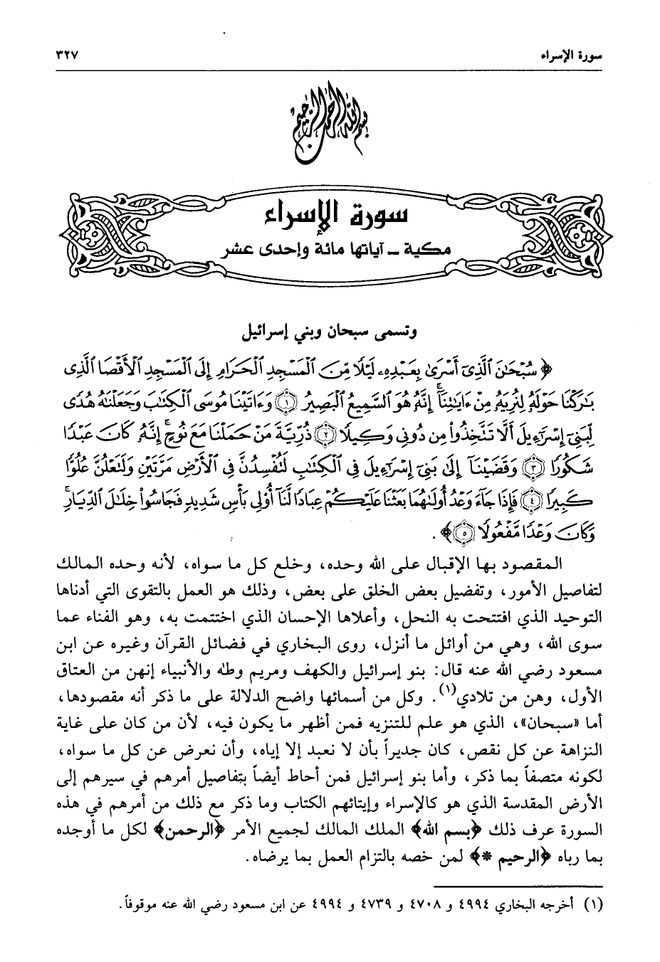 ) سُبْحَانَ الَّذِي أَسْرَى بِعَبْدِهِ لَيْلاً مِّنَ الْمَسْجِدِ الْحَرَامِ إِلَى الْمَسْجِدِ الأَقْصَى الَّذِي بَارَكْنَا حَوْلَهُ لِنُرِيَهُ مِنْ آيَاتِنَآ إِنَّهُ هُوَ السَّمِيعُ البَصِيرُ وَآتَيْنَآ مُوسَى الْكِتَابَ وَجَعَلْنَاهُ هُدًى لِّبَنِي إِسْرَائِيلَ أَلاَّ تَتَّخِذُواْ مِن دُونِي وَكِيلاً ذُرِّيَّةَ مَنْ حَمَلْنَا مَعَ نُوحٍ إِنَّهُ كَانَ عَبْداً شَكُوراً وَقَضَيْنَآ إِلَى بَنِي إِسْرَائِيلَ فِي الْكِتَابِ لَتُفْسِدُنَّ فِي الأَرْضِ مَرَّتَيْنِ وَلَتَعْلُنَّ عُلُوّاً كَبِيراً فَإِذَا جَآءَ وَعْدُ أُولاهُمَا بَعَثْنَا عَلَيْكُمْ عِبَاداً لَّنَآ أُوْلِي بَأْسٍ شَدِيدٍ فَجَاسُواْ خِلاَلَ الدِّيَارِ وَكَانَ وَعْداً مَّفْعُولاً ( ( )