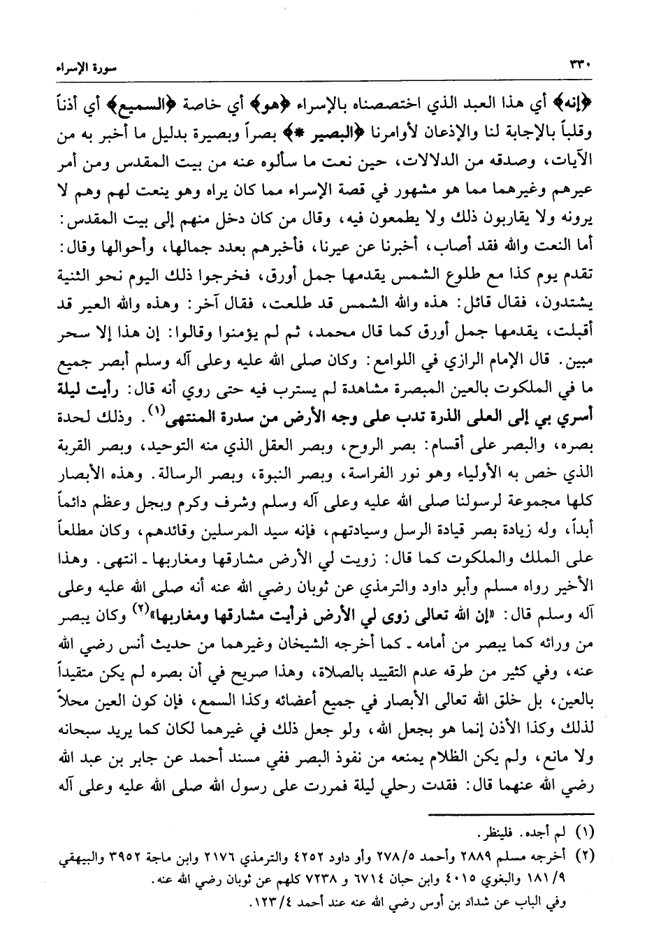 قال الإمام الرازي في اللوامع : وكان صلى الله عليه وعلى آله وسلم أبصرجميع ما في الملكوت بالعين المبصرة مشاهدة لم يتسرب فيه حتى روي أنه قال : ( رأيت ليلة أسري بي إلى العلى الذرة تدب على وجه الأرض من سدرة المنتهى .