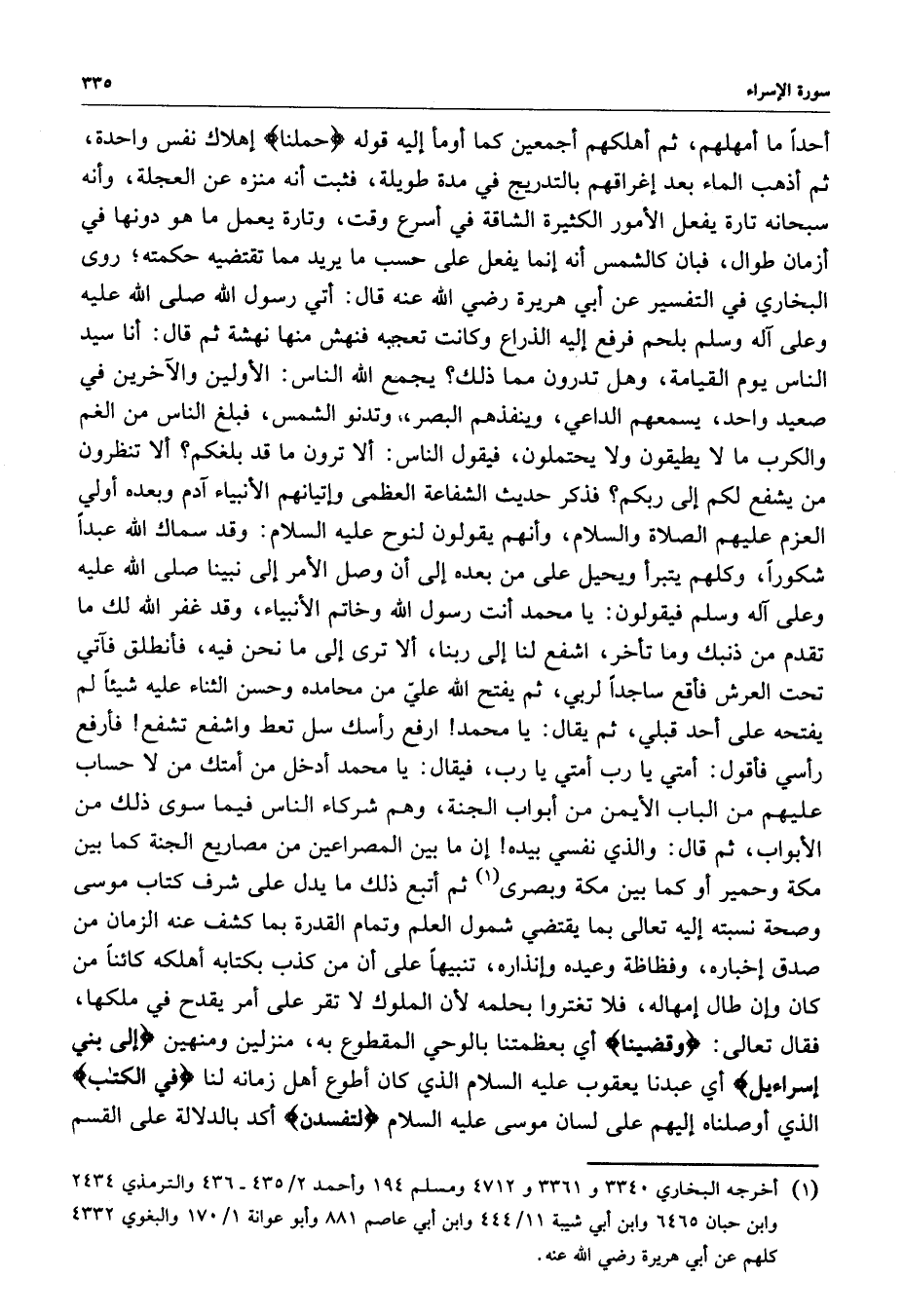 أحداً ما أمهلهم ، ثم أهلكهم أجمعين كما أومأ إليه قوله ) حملنا ( إهلاك نفس واحدة ، ثم أذهب الماء بعد إغراقهم بالتدريج في مدة طويلة ، فثبت أنه منزه عن العجلة ، وأنه سبحانه تارة يفعل الأمور الكثيرة الشاقة في أسرع وقت ، وترة يعمل ما هو دونها في أزمان طوال ، فبان كالشمس أنه إنما يفعل على حسب ما يريد مما تقتضيه حكمته ، وأنه البخاري في التفسير عن أبي هريرة رضي الله عنه قال : أتى رسول الله صلى الله عليه وعلى آله وسلم بلحم فرفع إليه الذراع وكانت تعجبه فنهش منها نهشة ثم قال : أنا سيد الناس يوم القيامة ، وهل تدرون مما ذلك ؟ يجمع الله الناس : الأولين والآخرين في صعيد واحد ، يسمعهم الداعي ، وينفذهم البصر ، وتدنو الشمس ، فبلغ الناس من الغم والكرب ما لا يطيقون ولا يحتملونن فيقول الناس : ألا ترون ما قد بلغكم ؟ ألا تنظرون من يشفع لكم إلى ربكم ؟ فذكر حديث الشفاعة العظمى وإتيانهم الأنبياء آدم وبعده أولي العزم عليهم الصلاة والسلام ، وأنهم يقولون لنوح عليه السلام : وقد سماك الله عبداً شكوراً ، وكلهم يتبرأ ويحيل على من بعده إلى أن وصل الأمر نبينا صلى الله عليه وعلى آله وسلم قيقولون : يا محمد أنت رسول الله وخاتم الأنبياء ، وقد غفر الله لك ما تقدم من ذنبك وما تأخر ، اشفع لنا إلى ربنا ، ألا ترى إلى ما نحن فيه ، فأنطلق فآتي تحت العرش فأقع ساجداً لربي ، ثم يفتح الله عليّ من محامده وحسن الثناء عليه شيئاً لم يفتحه على أحد قبلي ، ثم قال : يا محمد ارفع رأسك سل تعط واشفع تشفع فأرفع رأسي فأقول : أمتي يا رب أمتي يا ربن فيقال : يا محمد أدخل من أمتك من لا حساب عليهم من الباب الأيمن من أبواب الجنة ، وهم شركاء الناس فيما سوى ذلك من الأبواب ، ثم قال : والذي نفسي بيده إن ما بين المصراعين من مصاريع الجنة كما بين مكة وحمير أو كما بين مكة وبصرى ثم أتبع ذلك ما يدل على شرف كتاب موسى وصحة نسبته إليه تعالى بما يقتضي شمول العلم وتمام القدرة بما كشف عنه الزمان من صدق إخبارهن وفظاظة وعيده وإنذاره ، تنبيهاً على أن من كذب بكتابه أهلكه كائناً من كان وإن طال إمهاله ، فلا تغتروا بحلمه لأن الملوك لا تقر على أمر يقدح في ملكها ، فقال تعالى : ( وقضينا ) أي بعظمتنا بالوحي المقطوع به ، منزلين ومنهين ) إلى بني إسرائيل ) أي عبدنا يعقوب عليه السلام الذي كان أطوع أهل زمانه لنا ) في الكتاب ( الذي أوصلناه إليهم على لسان موسى عليه السلام ) لتفسدن ( أكد بالدلالة على القسم