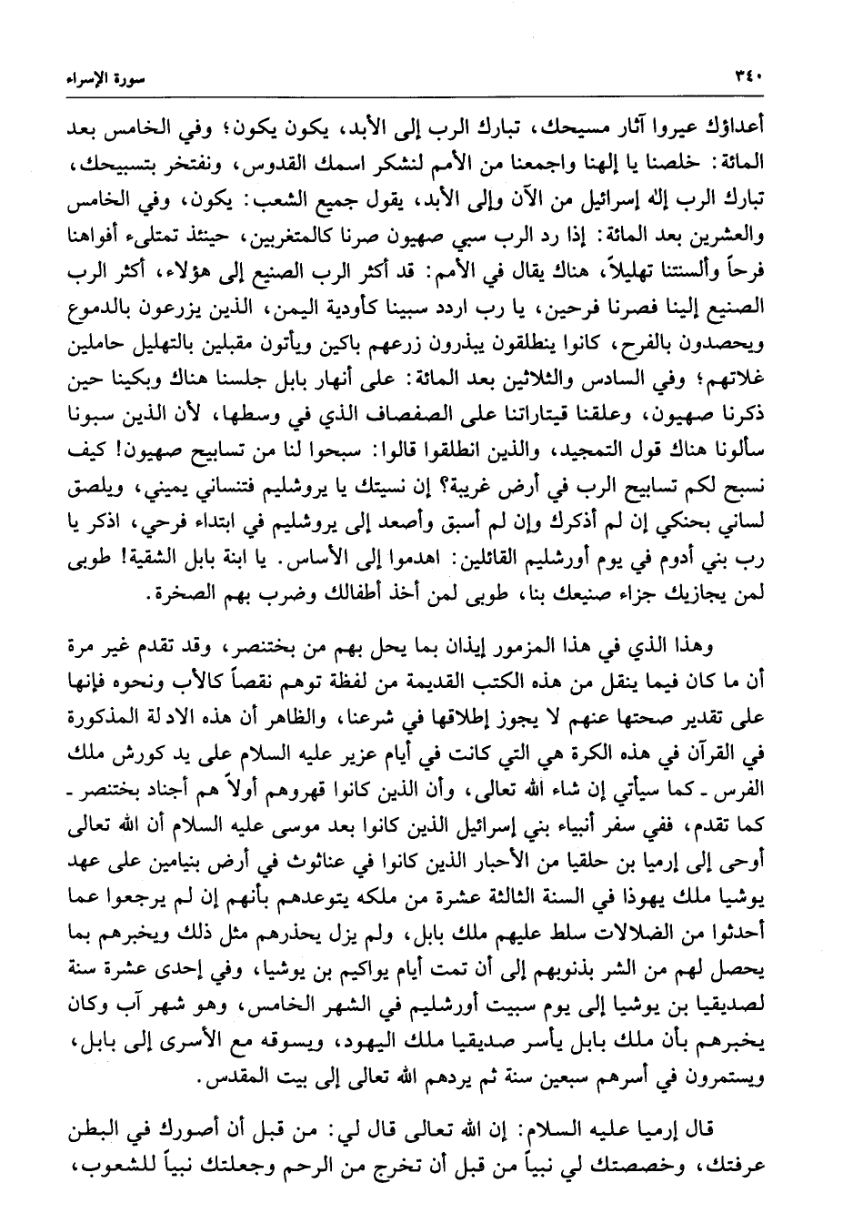 وهذا الذي في هذا المزمور إيذان بما يحل بهم من بختنصر ، وقد تقدم غير مرة أن ما كان فيما ينقل من هذه الكتب القديمة من لفظة توهم نقصاً كالأب ونحوه فإنها على تقدير صحتها عنهم لا يجوز إطلاقها في شرعنا ، والظاهر أن هذه الادلة المذكورة في القرآن في هذه الكرة هي التي كانت في أيام عزير عليه السلام على يد كورش ملك الفرس - كما سيأتي إن شاء الله تعالى ، وأن الذين كانوا قهروهم أولاً هم أجناد بختنصر - كما تقدم ، ففي سفر أنبياء بني إسرائيل الذين كانوا في عناثوث في أرض بنيامين على عهد يوشيا ملك يهوذا في السنة الثالثة عشرة من ملكه يتوعدهم بأنهم إن لم يرجعوا عما أحدثوا من الضلالات سلط عليهم ملك بابل ، ولم يزل يحذرهم مثل ذلك ويخبرهم بما يحصل لهم من الشر بذنوبهم إلى أن تمت أيام يواكيم بن يوشيا ، وفي غحدى عشرة سنة لصديقيا بن يوشيا إلى يوم سبيت أورشليم في الشهر الخامس ، وهو شهر آب وكان يخبرهم بأن ملك بابل يأسر صديقيا ملك اليهود ، ويسوقه مع الأسرى إلى بابل ، ويستمرون في أسرهم سبعين سنة ثم يردهم الله تعالى إلى بيت المقدس .