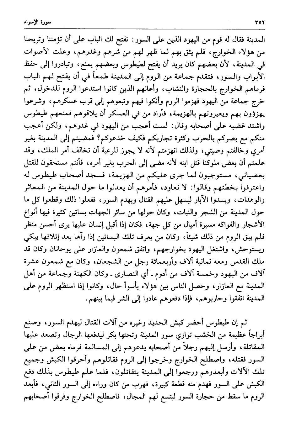 المدينة فقال له قوم من اليهود الذين على السور : نفتح لك الباب على أن تؤمننا وتريحنا من هؤلاء الخوارج ، فلم يثق بهم لهم من شرهم وغدرهم ، وعلت الأصوات في المدينة ، لأن بعضهم كان يريد أن يفتح لطيطوس وبعضهم يمنع ، وتبادروا إلى حفظ الأبواب والسور ، فتقدم جماعة من الروم إلى المدينة طمعاً في أن يفتح لهم الباب فرماهم الخوارج بالحجارة والنشاب ، وأعانهم الذين كانوا استدعوا الروم للدخول ، ثم خرج جماعة من اليهود فهزموا الروم وأنكوا فيهم وتبعوهم إلى قرب عسكرهم ، وشرعوا يهزؤون بهم ويعيرونهم بالهزيمة ، فأراد من في العسكر أن يلاقوهم فمنعهم طيطوس واشتد غضبه على أصحابه وقال : لست أعجب من اليهود في غدرهم ، ولكن أعجب منكم مع بصركم بالحرب وكثرة تجاربكم فكيف خدعوكم ؟ فمضيتم إلى المدينة بغير أمري وخالفتم وصيتي ، ولذلك انهزمتم لأنه لا يجوز للرعيه أن تخالف أمر الملك ، وقد علمتم أن بعض ملوكنا قتل ابنه لأنه مضى إلى الحرب بغير أمره ، فأنتم مستحقون للقتل بعصياني ، مستوجبون لما جرى عليكم من الهزيمة ، فسجد أصحاب طيطوس له واعترفوا بخطئهم وقالوا : لا نعاود ، فأمرهم أن يعدلوا ما حول المدينة من المعاثر والوهدات ، ويسدوا الآبار ليسهل عليهم القتال ويهدم السور ، ففعلوا ذلك وقطعوا كل ما حول المدينة من الشجر والنبات ، وكان حولها من سائر الجهات بساتين كثيرة فيها أنواع الأشجار والفواكه مسيرة أميال من كل جهة ، فكان إذا أقبل إنسان عليها يرى أحسن منظر فلم يبق الروم من ذلك شيئاً ، وكان من يعرف تلك البساتين إذا رآها بعد إتلافها يبكي ويستوحش ، واشتغل اليهود بخوارجهم ، واتفق شمعون والعازار على يوحانان وكان قد ملك القدس ومعه ثمانية آلاف وأربعمائة رجل من الشجعان ، وكان مع شمعون عشرة آلاف من اليهود وخمسة آلاف من أدوم - أي النصارى - وكان الكهنة وجماعة من أهل المدينة مع العازارن وحصل الناس بين هؤلاء بأسوأ حال ، وكانوا إذا استظهر الروم على المدينة اتفقوا وحاربوهم ، فإذا دفعوهم عادوا إلى الشر فيما بينهم .