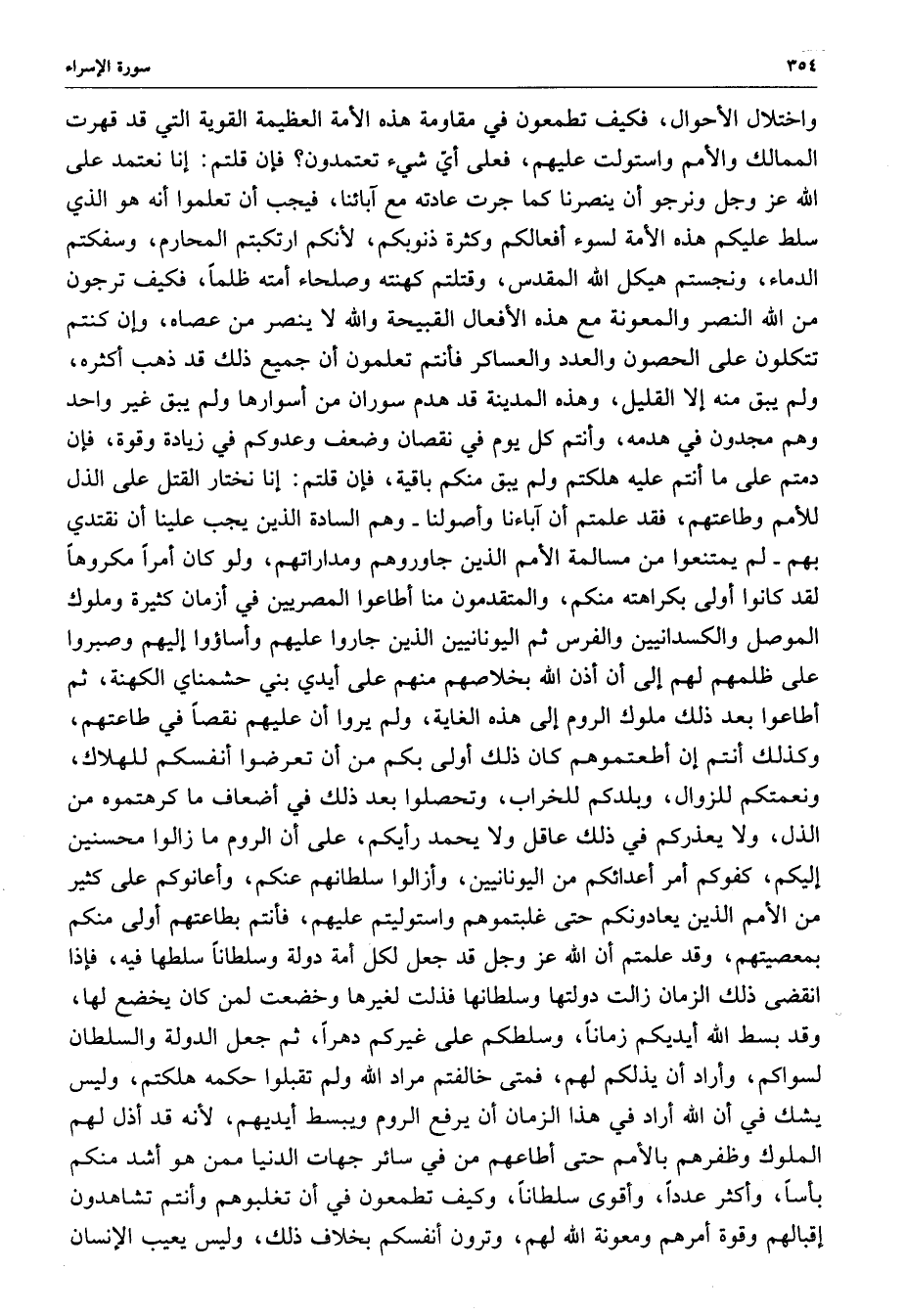 واختلال الأحوال ، فكيف تطمعون في مقاومة هذه الأمة العظيمة القوية التي قد قهرت الممالك والأمم والستولت عليهم ، فعلى أيّ شيء تعتمدون ؟ فإن قلتم : إنا نعتمد على الله عزوجل ونرجوا أن ينصرنا كما جرت عادته مع آبائنا ، فيجب أن علموا أنه هو الذي سلط عليكم هذه الأمة لسوء أفعالكم وكثرة ذنوبكم ، لأنكم ارتكبتم المحارم ، وسفكتم الدماء ، ونجستم هيكل الله المقدس ، قوتلتم كهنته وصلحاء أمته ظلماً ، فكيف ترجون من الله النصر والمعونة مع هذه الأفعال القبيحة والله لا ينصر من عصاه ، وإن كنتم تتكلون على الحصون والعدد والعساكر فأنتم تعلمون أن جميع ذلك قد ذهب أكثره ، ولم يبق منه إلا القليل ، وهذه المدينة قد هدم سوران من أسوارها ولم يبق غير واحدد وهم مجدون في هدمه ، أنتم كل يوم في نقصان وضعف وعدوكم في زيادة وقوة ، فإن دمتم على ما أنتم عليه هلكتم ولم يبق منكم باقية ، فإن قلتم : إنا نختار القتل على الذل للأمم وطاعتهم ، فقد علمتم أن آباءنا وأصولنا - وهم السادة الذين يجب علينا أن نقتدي بهم - لم يمتنعوا منمسالمة الأمم الذين جاوروهم ومداراتهم ، ولو كان أمراً مكروهاً لقد كانوا ولى بكراهته منكم ، والمتقدمون منا أطاعوا المصريين في أزمان كثيرة ملوك الموصل والكسدانيين والفرس ثم اليونانيين الذين جاروا عليهم وأساؤوا إليه وصبروا على ظلمهم لهم على أن أذن الله بخلاصهم منهم على أيدي بني حشمناي الكهنة ، ( صلى الله عليه وسلم )
