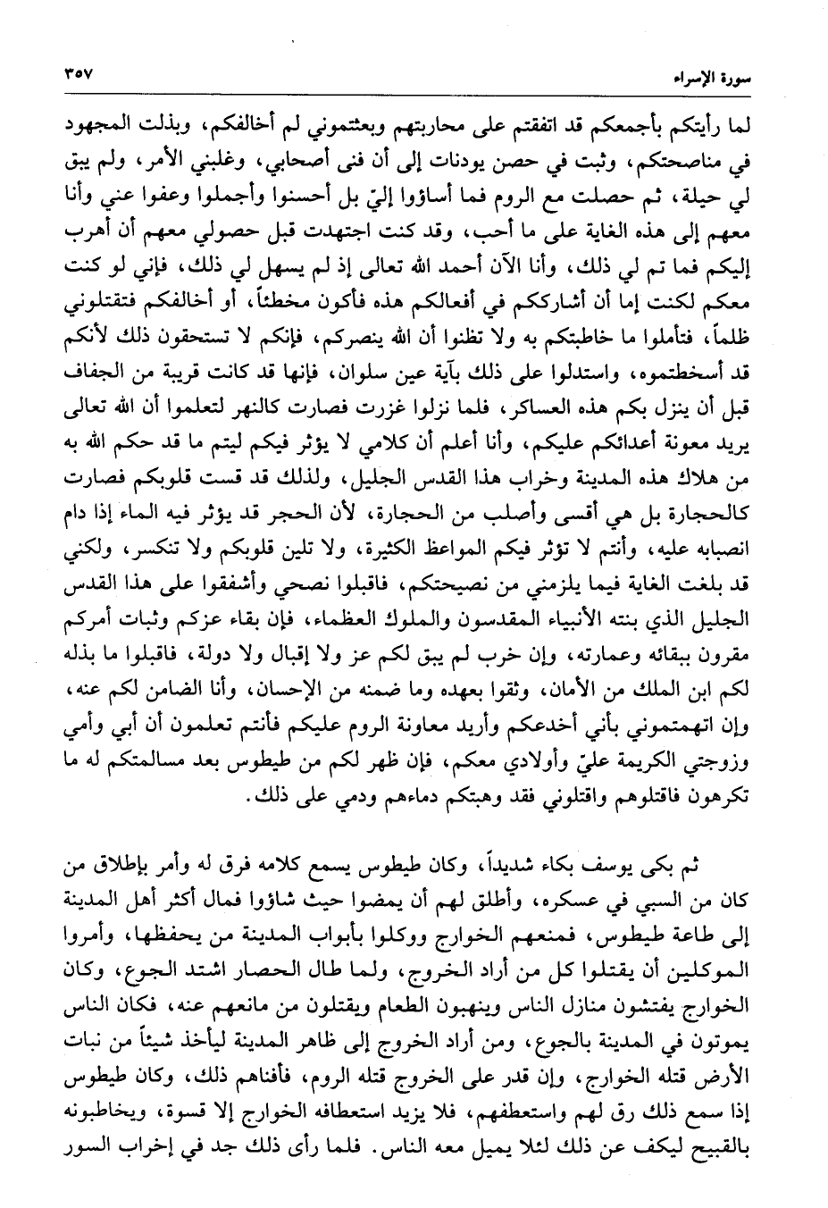 لما رأيتكم بأجمعكم قد اتفقتم على محاربتهم وبعثتموني لم أخالفكم ، وبذلت المجهود في مناصحتكم ، وثبت في حصن يودنات إلى أن فنى أصحابي ، وغلبني الأمر ، ولم يبق لي حيلة ، ثم حصلت مع الروم فما أساؤوا إليّ بل أحسنوا وأجملوا وعفو عني وأنا معهم إلى هذه الغاية على ما أحب ، وقد كنت اجتهدت قبل حصولي معهم أن أهب إليكم فما تم لي ذلك ، وأنا الآن أحمد الله تعالى إذ لم يسهل لي ذلك ، فإني لو كنت معكم لنت إما أن أشارككم في أفعالكم هذه فأكون مخطئاً ، أو أخالفكم فتقتلوني ظلماً ، فتأملوا ما خاطبتكم به ولا تظنوا أن الله ينصركم ، فإنكم لا تستحقون ذلك لأنكم قد أسخطتموه ، واستدلواعلى ذلك بآية عين سلوان ، فإنها قد كانت قريبة من الجفاف قبل أن ينزل بكم هذه العساكر ، فلما نزلوا غزرت فصارت كالنهر لتعلموا أن الله تعالى يريد معونة أعدائكم عليكم ، وأنا أعلم أن كلامي لا يؤثر فيكم ليتم ما قد حكم الله به كالحجارة بل هي أقسى وأصلب من الحجارة ، لأن الحجر قد يؤثر فيه الماء إذا دام انصبابه عليه ، وأنتم لا تؤثر فيكم المواعظ الكثيرة ، ولا تلين قلوبكم ولا تنكسر ، ولكن قد بلغت الغاية فيما يلزمني من نصيحتكم ، فاقبلوا نصحي وأشفقوا على هذا القدس الجليل الذي بنته الأنبياء المقدسون والملوك العظماء ، فإن بقاء عزكم وثبات أمركم مقرون ببقائه وعمارته ، وإن خرب لم يبق لكم عز ولا إقبال ولا دولة ، فاقبلوا ما بذله لكم ابن الملك من الأمان ، وثقوا بعهده وما ضمنه من الإحسان ، وأنا الضامن لكم عنه ، وإن اتهمتموني بأني أخدعكم وأريد معاونة الروم عليكم فأنتم تعلمون أن أبي وأمي وزوجي الكريمة لعيّ وأولادي معكم ، فإن ظهر لكم من طيطوس بعد مسالمتكم له ما تكرهون فاقتلوهم واقتلوني فقد وهبتكم دماءهم ودمي على ذلم .