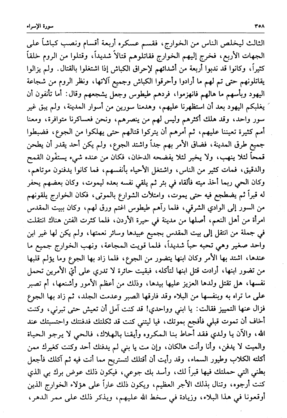 الأربع ، فخرج إليهم الخوارج فقاتلوهم قتالاً شديداً ، وقتلوا من الروم خلقاً كثيراً ، وكانوا قد ندبوا أربعة من أشدائهم لإحراق الكباش إذا اشتغلوا بالقتال ، ولم يزالوا يقاتلونهم حتى تم لهم ما أرادوا وأحرقوا الكباش وجميع آلاتها ، ونظر الروم من شجاعة اليهود وبأسهم ما هالهم فانهزموا ، فردهم طيطوس وجعل يشجعهم وقال : أما تأنفون أن يغلبكم اليهود بعد أن استظهرنا عليهم ، وهدمنا سورين من أسوار المدينة ، ولم يبق غير سور واجد ، وقد هلك أكثرهم وليس لهم من ينصرهم ، ونحن فعساكرنا متوافرة ، ومعنا أمم كثيرة تعيننا عليهم ، ثم أمرهم أن يتركوا قتالهم حتى يهلكوا من الجوع ، فضبطوا جميع طرق المدينة ، فضاق الأمر بهم جداً واشتد الجوع ، ولم يكن أحد يقدر أن يطحن قمحاً لئلا ينهب ، ولا يخبر لئلا يفضحه الدخان ، فكان من عنده شيء يستفّون القمح والدقيق ، فمات كثير من الناس ، واشتغل الأحياء بأنفسهمن فما كانوا يدفنون موتاهم ، وكان الحي ربما أخذ ميته فألقاه في بئر ثم يلقي نفسه بعده ليموت ، وكان بعضهم يحفر له قراً ثم يضطجع فيه حتى يموت ، وامتلأت الشوارع بالموتى ، فكان الخوارج يلقونهم من السور إلى الوادي الشرقي ، فلما رآهم طيطوس اغتنم ورق لهم ، وكان ببيت المقدس امرأة من أهل النعم ، أصلها من مدينة في حيرة الأردن ، فلما كثرت الفتن هناك انتقلت في جملة من انتقل إلى بيت المقدس بجميع عبيدها وسائر نعمتها ، ولم يكن لها غير ابن واحد صغير وهي تحبه حباً شديداً ، فلما قويت المجاعة ، ونهب الخوارج جميع ما عندها ، اشتد بها الأمر وكان ابنها تضور من الجوع ، فلما زاد بها الجوع وما يؤلم قلبها من تضور ابنها ، ارادت قتل ابنها لتأكله ، فبقيت حائرة لا تدري على أي الأمرين تحمل نفسها ، هل تقتل ولدها العزيز عليها بيدها ، وذلك من أعظم الأمور وأشنعها ، أم تصبر على ما تراه به وبنفسها من البلاء وقد فارقها الصبر وعدمت الجلد ، ثم زاد بها الدوع فزال عنها التمييز فقالت : يا ابني وواحدي قد كنت آمل أن تعيش حتى تبرني ، وكنت أخاف أن تموت قبلي فأفجع بموتك ، فيا ليتني كنت قد ثكلتك فدفنتك واحتسبتك عند الله ، والآن يا ولدي فقد أحاط بنا المكروه وأيقنا بالهلاك ، فالحي لا يرجو الحياة والميت لا يدفن ، وأنا وأنت هالكان ، وإن مت يا بني لم يدفنك أحد وكنت كغيرك ممن أكلته الكلاب وطيور السماء ، وقد رأيت أن أقتلك لتستريح مما أنت فيه ثم آكلك فأجلع بطني التي حملتك فيها قبراً لك ، وأسد بك جوعي ، فيكون ذلك عوض برك بي الذي كنت أرجوه ، وتناف بذلك الأجر العظيم ، ويكون ذلك عاراً على هؤلاء الخوارج الذي أوقعونا في هذا البلاء ، وزيادة في سخط الله عليهم ، ويذكر ذلك على ممر الدهر ،