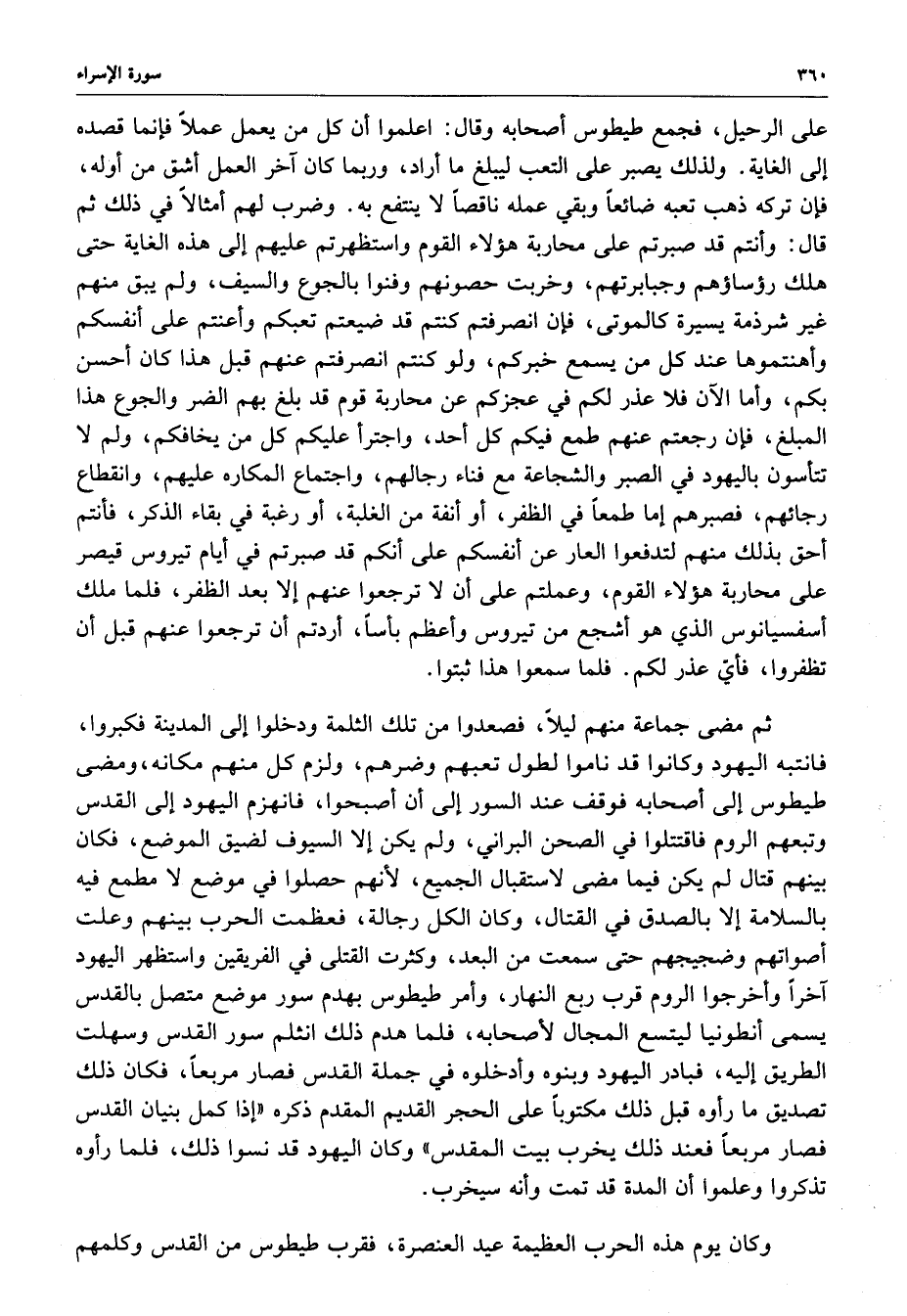 وضرب لهم أمثالاً في ذلك ثم قال : وأنتم قد صبرتم على محاربة هؤلاء القوم واستظهرتم عليهم إلى هذه الغاية حتى هلك رؤساؤهم وجبابرتهم ، وخربت حصونهم ونفوا بالجوع والسف ، ولم يبق منهم غير شرذمة يسيرة كالموتى ، فأن انصرفتم كنتم قد ضيعتم تعبكم وأنتم علىأنفسكم أهنتموها عند كل من يسمع خبركم ، ولو كنتم انصرفتم عنهم قبل هذا كان أحسن بكم ، وأما الآن فلا عذر لكم في عجزكم عن محاربة قوم قد بلغ بهم الضر والجوع هذا المبلغ ، فإن رجعتم عنهم طمع فيكم كل أحد ، واجترأ عليكم كل من يخافكم ، ولم لا تتأسون باليهود في الصبر والشجاعة مع فناء رجالهم ، واجتماع المكاره عليهم ، وانقطاع رجائهم ، فصبرهم إما طمعاً في الظفر ، أو أنفة من الغلبة ، أو رغبة في بقاء الذكر ، فأنتم أحق بذلك منهم لتدفعوا العار عن أنفسكم على أنكم قد صبرتم في أيام تيروس قيصر على محاربة هؤلاء القوم ، وعملتم على أن لا ترجعوا عنهم إلا بعد الظفر ، فلما ملك أسفسيانوس الذي هو أشجع من تيروس وأعظم بأساً ، أردتم أن ترجعوا عنهم قبل أن تظفروا ، فأيّ عذر لكم .