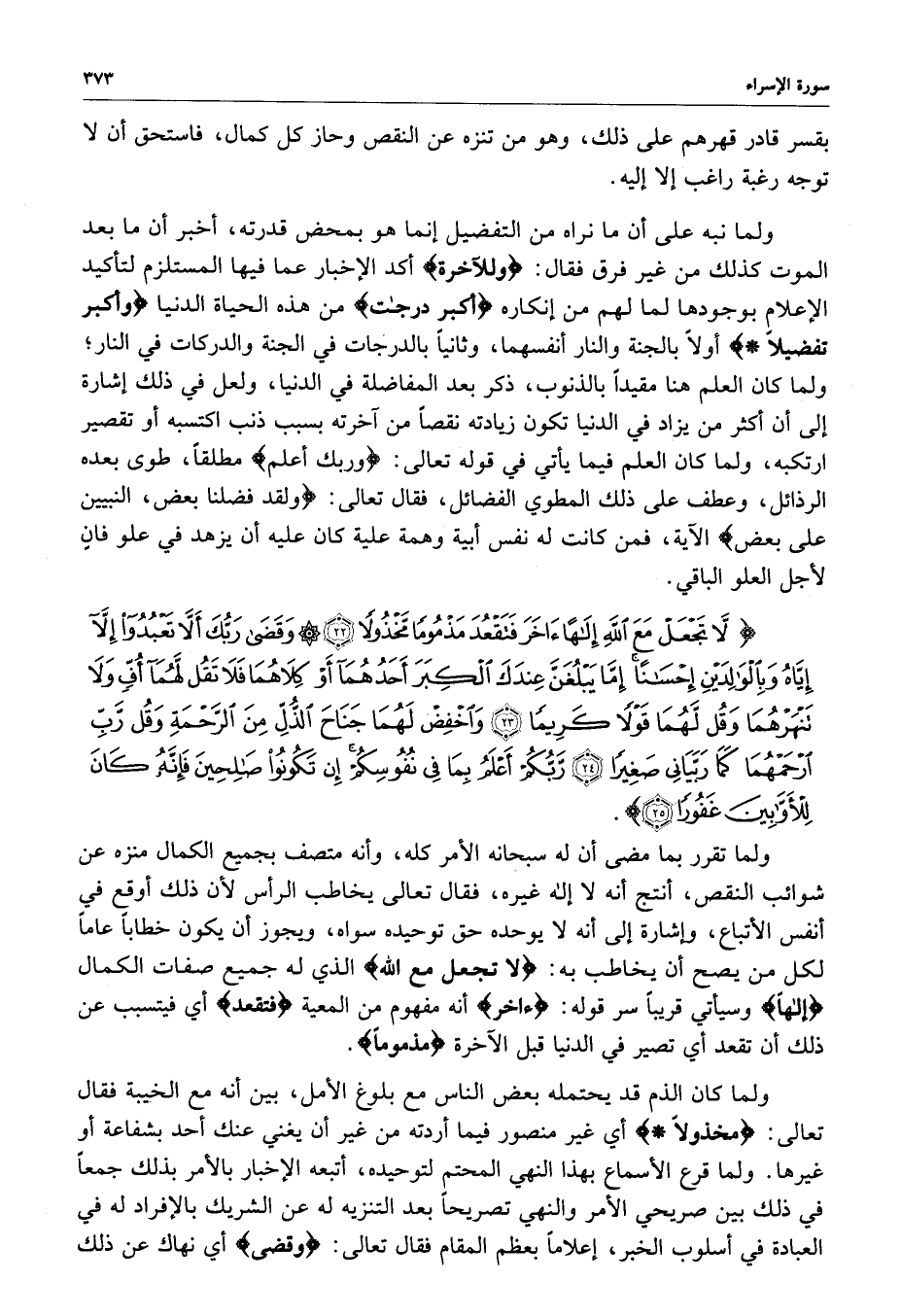 ) لاَّ تَجْعَل مَعَ اللَّهِ إِلَهاً آخَرَ فَتَقْعُدَ مَذْمُوماً مَّخْذُولاً وَقَضَى رَبُّكَ أَلاَّ تَعْبُدُواْ إِلاَّ إِيَّاهُ وَبِالْوَالِدَيْنِ إِحْسَاناً إِمَّا يَبْلُغَنَّ عِندَكَ الْكِبَرَ أَحَدُهُمَا أَوْ كِلاَهُمَا فَلاَ تَقُل لَّهُمَآ أُفٍّ وَلاَ تَنْهَرْهُمَا وَقُل لَّهُمَا قَوْلاً كَرِيماً وَاخْفِضْ لَهُمَا جَنَاحَ الذُّلِّ مِنَ الرَّحْمَةِ وَقُل رَّبِّ ارْحَمْهُمَا كَمَا رَبَّيَانِي صَغِيراً رَّبُّكُمْ أَعْلَمُ بِمَا فِي نُفُوسِكُمْ إِن تَكُونُواْ صَالِحِينَ فَإِنَّهُ كَانَ لِلأَوَّابِينَ غَفُوراً ( ( )