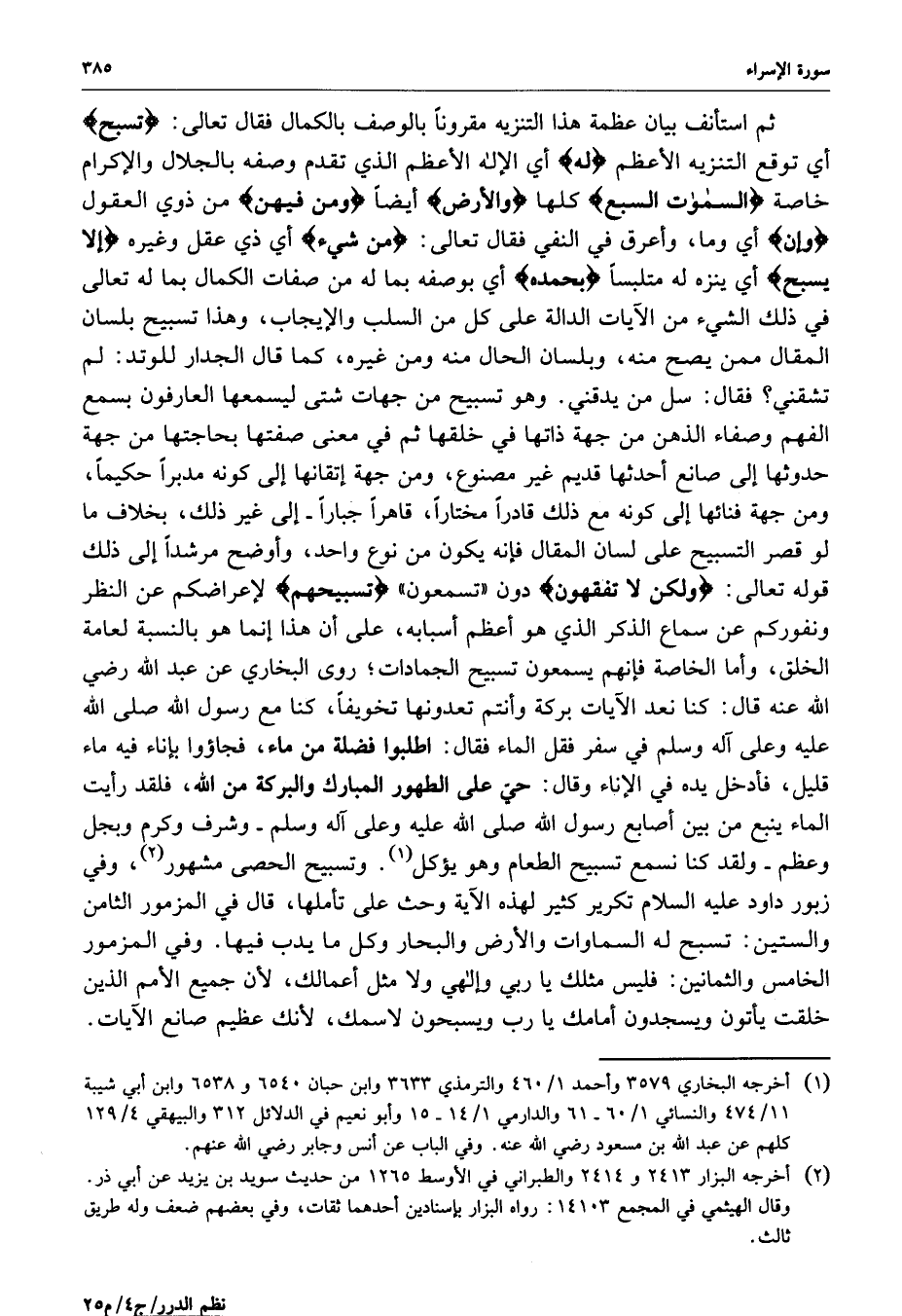 وهو تسبيح من جهات شتى ليسمعها العارفون بسمع الفهم وصفاء الذهن من جهة ذاتها في خلقها ثم في معنى صفتها بحاجتها من جهة حدوثها إلى صانع أحدثها قديم غير مصنوع ، ومن جهة إتقانها إلى كونه مدبراً حكيماً ، ومن جهة فنائها إلى كونه مع ذلك قادراً مختاراً ، قاهراً جباراً - إلى غير ذلك ، بخلاف ما لو قصر التسبيح على لسان المقال فإنه يكون من نوع واحد ، وأوضح مرشداً إلى ذلك قوله تعالى : ( ولكن لا تفقهون ( دون ( تسمعون ) ) تسبيحهم ( لإعراضكم عن النظر زنفوزكم عن سماع الذكر الذي هو أعظم أسبابه ، على أن هذا إنما هو بالنسبة لعامة الخلق ، وأما الخاصة فإنهم يسمعون تسبيح الجمادات ؛ روى البخاري عن عبد الله رضي الله عنه قال : كنا نعد الآيات بركة وأنتم تعدونها تخويفاًن كنا مع رسول الله صلى الله عليه وعلى آله وسلم في سفر فقل الماء فقال : اطلبوا فضلة من ماء ، فجاؤوا بإناء فيه ماء قليل : فأدخل يده في الإناء وقال : حيّ على الطهور المبارك والبركة من الله ، فلقد رأيت الماء ينبع من بين أصابع رسول الله صلى الله عليه وعلى آله وسلم - وشرف وكرم وبجل وعظم - ولقد كنا نسمع تسبيح الطعام وهو يؤكل .