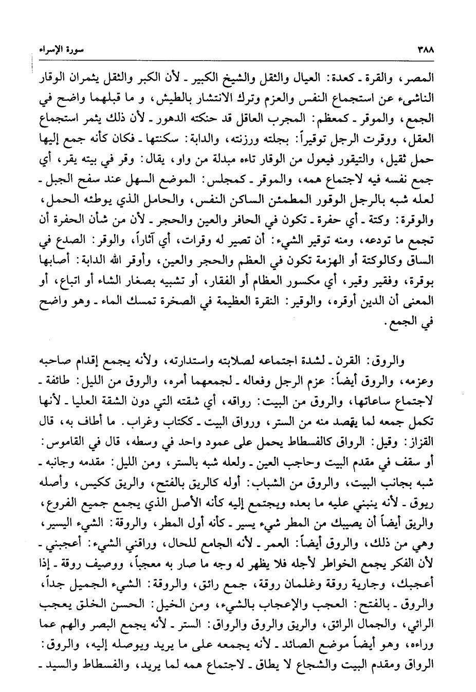 المصر ، والقرة - كعدة : العيال والثقل والشيخ الكبير - لأن الكبر والثقل يثمران الوقار الناشئ عن استجماع النفس والعزم وترك الانتشار بالطيش ، وما قبلهما واضح في الجمع ، والموقر - كمعظم : المجرب العاقل قد حنكته الدهور - لأن ذلك يثمر استجماع العقل ، ووقرت الرجل توقيراً : بجلته ورزنته ، والدابة : سكنتها - فكان كأنه جمع إليها حمل ثقيل ، والتيقور فيعول من الوقار تاءه مبدلة من واو ، يقال : وقر في بيته يقر ، أي جمع نفسه فيه لاجتماع همه ، والمرقر - كمجلس : الموضع السهل عند سفح الجبل - لعله شبه بالرجل الوقور المطمئن الساكن النفس ، والحامل الذي يوطئه الحمل ، والوقرة : وكتة - أي حفرة - تكون في الحافر والعين والحجر - لأن من شأن الحفرة أن تجمع ما تودعه ، ومنه توقير الشيء : أن تصير له وقرات ، أي آثاراً ، والوقر : الصدع في الساق وكالوكتة أو الهزمة تكون في العظم والحجر والعين ، وأوقر الله الدابة : أصابها بوقرة ، وفقير وقير ، أي مكسور العظام أو الفقار ، أو تشبيه بصغار الشاء أو اتباع ، أو المعنى أن الدين أوقره ، والوقير : النقرة العظيمة في الصخرة تمسك الماء - وهو واضح في الجمع .