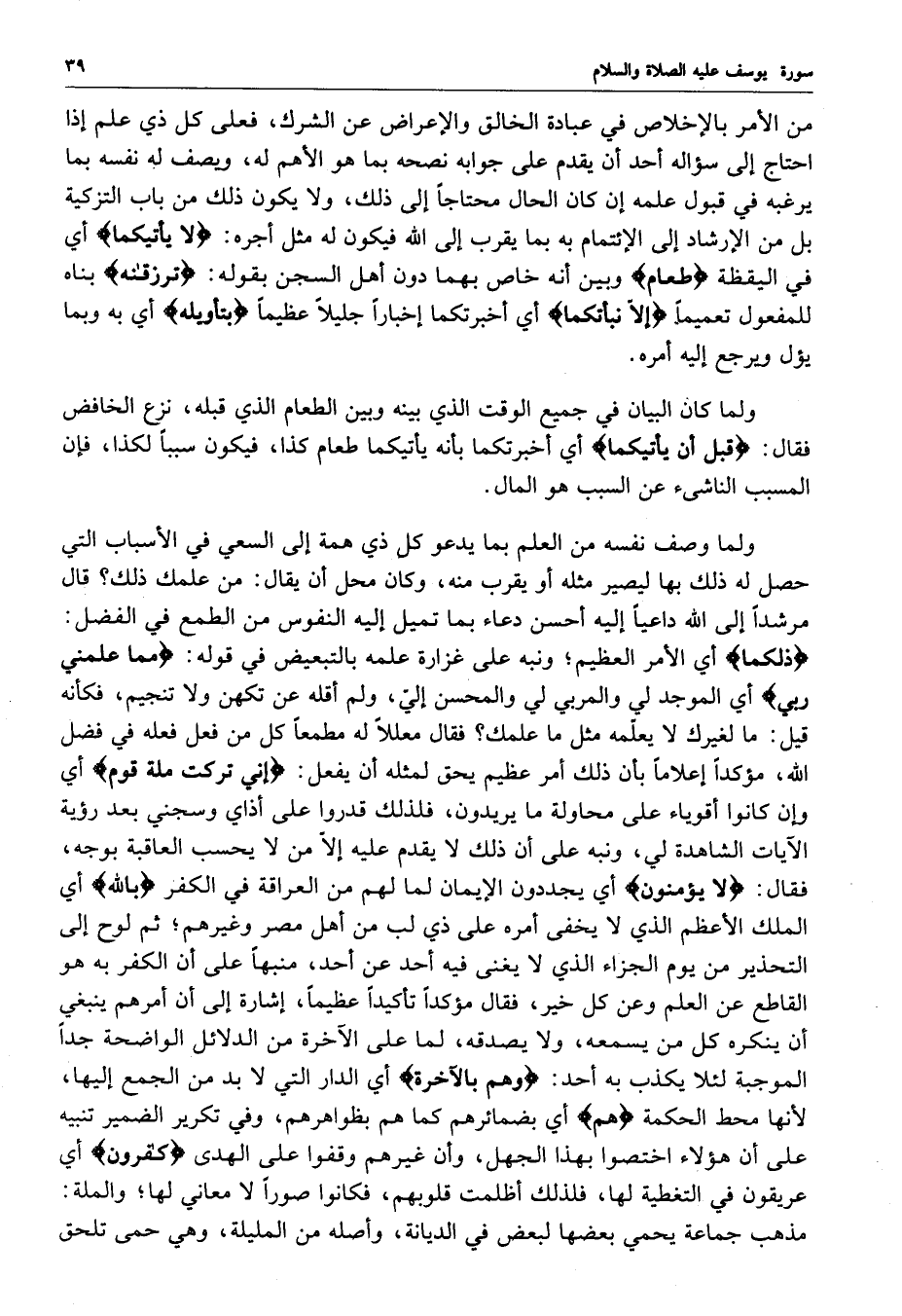 ولما وصف نفسه من العلم بما يدعو كل ذي همة إلى السعي في الأسباب التي حصل له ذلك بها ليصير مثله أو يقرب منه ، وكان محل أن يقال : من علمك ذلك ؟ قال مرشداً إلى الله داعياً إليه أحسن دعاء بما تميل إليه النفوس من الطمع في الفضل : ( ذلكما ) أي الأمر العظيم ؛ ونبه على غزارة علمه بالتبعيض في قوله : ( مما علمني ربي ) أي الموجد لي والمربي لي والمحسن إليّ ، ولم أقله عن تكهن ولا تنجم ، فكأنه قيل : ما لغيرك لا يعلّمه مثل ما علمك ؟ فقال معللاً له مطمعاً كل من فعل فعله في فضل الله ، مؤكداً إعلاماً بأن ذلك أمر عظيم يحق لمثله أن يفعل : ( إني تركت ملة قوم ) أي وإن كانوا أقوياء على محاولة ما يريدون ، فلذلك قدروا على أذاي وسجني بعد رؤية الآيات الشاهدة لي ، نبه على أن ذلك لا يقدم عليه إلاّ من لا يحسب العاقبة بوجه ، فقال : ( لا يؤمنون ) أي يجددون الإيمان لما لهم من العراقة في الكفر ) بالله ) أي الملك الأعظم الذي لا يخفي أمره على ذي لب من أهل مصر وغيرهم ؛ ثم لوح إلى التحذير من يوم الجزاء الذي لا يغني فيه أحد عن أحد ، منبهاً على أن الكفر به هو القاطع عن العلم وعن كل خير ، فقال مؤكداً تأكيداً عظيماً ، إشارة إلى أن أمرهم ينبغي أن ينكره كل من يسمعه ، ولا يصدقه ، لما على الآخرة من الدلائل الواضحة جداً الموجبة لئلا يكذب به أحد : ( وهم بالآخرة ) أي الدار التي لا بد من الجمع إليها ، لأنها محط الحكمة ) هم ) أي بضمائرهم كما هم بظواهرهم ، وفي تكرير الضمير تنبيه على أن هؤلاء اختصوا بهذا الجهل ، وأن غيرهم وقفوا على الهدى ) كافرون ) أي عريقون في التغطية لها ، فلذلك أظلمت قلوبهم فكانوا صوراً لا معاني لها ؛ والملة : مذهب جماعة يحمي بعضها لبعض في الديانة ، وأصله من المليلة ، وهي حمى تلحق