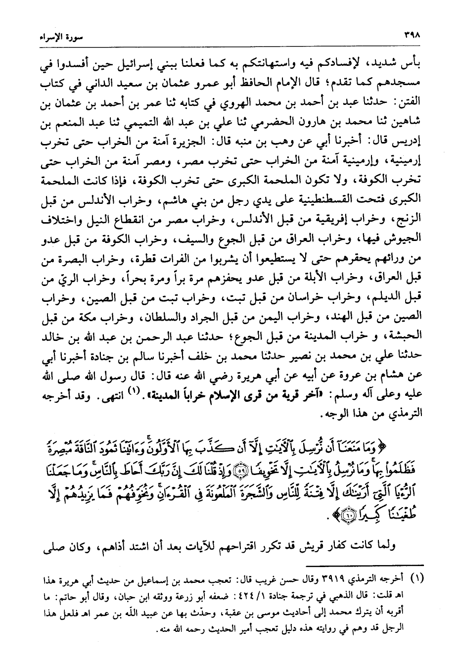 بأس شديد ، لإفسادكم فيه واستهانتكم به كما فعلنا ببني إسرائيل حين أفسدوا في مسجدهم كما تقدم ؛ قال الإمام الحافظ أبو عمرو عثمان بن سعيد الداني في كتاب الفتن : حدثنا عبد بن أحمد بن محمد الهروي في كتابه ثنا عمر بن أحمد بن عثمان بن شاهين ثنا محمد بن هارون الحضرمي ثنا علي بن عبدالله التميمي ثنا عبد المنعم بن إدريس قال : أخبرنا أبي عن وهب بن منبه قال : الجزيرة آمنة من الخراب حتى تخرب إرمينية آمنة من الخراب حتى تخرب مصر ، ومصر آمنة من الخراب حتى تخرب الكوفة ، ولا تكون الملحمة الكبرى حتى تخرب الكوفة ، فإذا كانت الملحمة الكبرى فتحت القسطنطينية على يد رجل من بني هاشم ، وخراب الأندلس من قبل الزنج ، وخراب إفريقية من قبل الأندلس ، وخراب مصر من انقطاع النيل واختلاف الجيوش فيها ، وخراب العرق قبل الجوع والسيف ، وخراب الكوفة من قبل عدو من ورائهم يحقرهم حتى لا يستطيعوا أن يشربوا من الفرات قطرة ، وخراب البصرة من قبل العراق ، وخراب الأبلة من قبل عدو يحفرهم مرة براً ومرة بحراً ، وخراب الريّ من قبل الديلم ، وخراب خراسان من قبل تبت ، وخراب تبت من قبل الصين ، وخراب الصين من قبل الهند ، وخراب اليمن من قبل الجراد والسلطان ، وخراب مكة من قبل الحبشة ، وخراب المدينة من قبل الجوع ؛ حدثنا عبد الرحمن بن عبد الله بن خالد حدثنا علي بن محمد بن نصير حدثنا محمد بن خلف أخبرنا سالم بن جنادة أخبرنا أبي عن هشام بن عروة عن أبيه عن أبي هريرة رضي الله عنه قال : رسول الله صلى الله عليه وعلى آله وسلم : ( آخر قرية من قرى الإسلام خراباً المدينة ) انتهى .