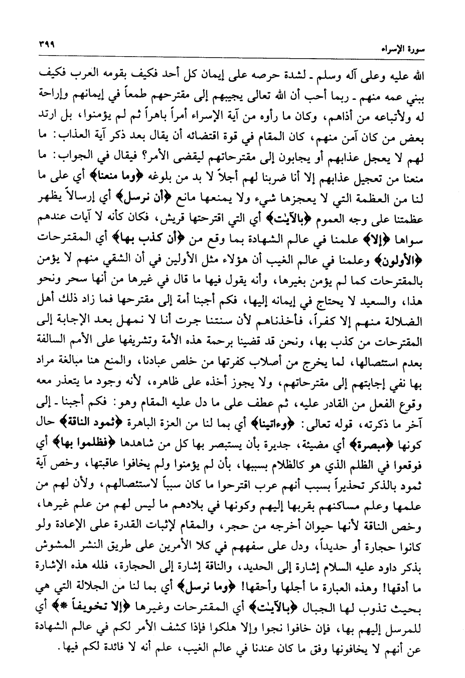 الله عليه وعلى آله وسلم - لشدة حرصه على إيمان كل أحد فكيف بقومه العرب فكيف ببني عمه منهم - ربما أحب أن الله تعالى يجيبهم إلى مقترحهم طمعاً في إيمانهم وإراحة له ولأتباعه من أذاهم ، وكان ما رأوه من آية الإسراء أمراً باهراً ثم لم يؤمنوا ، بل ارتد بعض من كان آمن منهم ، كان المقام في قوة اقتضائه أن يقال بعد ذكر آية العذاب : ما لهم لا يعجل عذابهم أو يجابون إلى مقترحاتهم ليقضى الأمر ؟ فيقال في الجواب : ما منعنا من تعجيل عذابهم إلا أنا ضربنا شيء ولا يمنعها مانع ) وما منعنا ) أي على ما لنا من العظمة التي لا يعجزها شيء ولا يمنعها مانع ) إن نرسل ) أي إرسالاً يظهر عظمتنا على وجه العموم ) بالآيان ) أي التي اقترحها قريش ، فكان كأنه لا آيات عندهم سواها ) إلا ( علمنا في عالم الشهادة بما وقع من ) أن كذب بها ) أي المقترحات ) الأولون ( وعلمنا في عالم الغيب أن هؤلاء مثل الأولين في أن الشقي منهم لا يؤمن بالمقترحات كما لم يؤمن بغيرها ، وأنه يقول فيها ما قال في غيرها من أنها سحر ونحو هذا ، والسعيد لا يحتاج في إيمانه إليها ، فكم أجبنا أمة إلى مقترحها فما زاد ذلك أهل الضلالة منهم إلا كفراً ، فأخذناهم لأن سنتنا جرت أنا لا نمهل بعد الإجابة إلى المقترحات كما لم يؤمن بغيرها ، وأنه يقول فيها ما قال في غيرها من أنها سحر ونحو بعدم استئصالها ، لما يخرج من أصلاب كفرتها برحمة هذه الأمة وتشريفها على الأمم السالفة بها نفي إجابتهم إلى مقترحاتهم ، ولا يجوز أخذه على ظاهره ، لأنه وجود ما يتعذر معه وقوع الفعل من القادر عليه ، ثم عطف على ما دل عليه المقام وهو : فكم أجبنا - إلى آخر ما ذكرته ، قوله تعالى : ( وءاتينا ) أي بما لنا من العزة الباهرة ) ثمود الناقة ( حال كونها ) مبصرة ) أي مضيئة ، جديرة بأن يستبصر بها كل من شاهدها ) فظلموا بها ) أي فوقعوا في الظلم الذي هو كالظلام بسببها ، بأن لم يؤمنوا ولم يخافوا عاقبتها ، وخص آية ثمود بالذكر تحذيراً بسبب أنهم عرب اقترحوا ما كان سبباً لاستئصالهم ، ولأن لهم من علمها وعلم مساكنهم بقربها إليهم وكونها في بلادهم ما ليس لهم من علم غيرها ، وخص الناقة لأنها حيوان أخرجه من حجر ، والمقام لإثبات القدرة على الإعادة ولو كانوا حجارة أو حديداً ، ول على سفههم في كلا الأمرين على طريق النشر المشوش بذكر داود عليه السلام إشارة إلى الحديد ، والناقة إشارة إلى الحجارة ، فلله هذه الإشارة ما أدقها وهذه العبارة ما أجلها وأحقها ) وما نرسل ) أي بما لنا من الجلالة التي هي بحيث تذوب لها الجبال ) بالآيات ) أي المقترحات وغيرها ) إلا تخويفاً ) أي للمرسل إليهم بها ، فإن خافوا نجوا وإلا هلكوا فإذا كشف الأمر لكم في عالم الشهادة عن أنهم لا يخافونها وفق ما كان عندنا في عالم الغيب ، علم أنه لا فائدة لكم فيها .