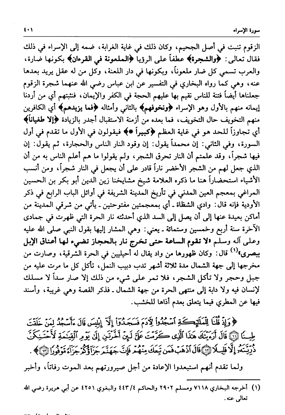 الزقوم تنبت في أصل الجحيم ، وكان ذلك في غاية الغرابة ، ضمه إلى الإسراء في ذلك فقال تعالى : ( والشجرة ( عطفاً على الرؤيا ) الملعونة في القرءان ( بكونها ضارة ، والعرب تسمي كل ضار ملعوناً ، وبكونها في دار اللعنة ، وكل من له عقل يريد بعدها عنه ، وهي كما رواه البخاري في التفسير عن ابن عباس رضي الله عنهما شجرة الزقوم جعلناها أيضاً فتنة للناس نقيم بها عليهم الحجة في الكفر والإيمان ، فنثنتهم أي من أردنا إيمانه منهم بالأول وهو الإسراء ) ونخوفهم ( بالثاني وأمثاله ) فما يزيدهم ) أي الكافرين منهم التخويف حال التخويفن فما بعده من أزمنة الاستقبال أجدر بالزيادة ) إلا طغياناً ) أي تجاوزاً للحد هو في غاية العظم ) كبيراً ( فيقلولون في الأول ما تقدم في أول السورة ، وفي الثاني : إن محمداً يقول : إن وقود النار الناس والحجارة ، ثم يقول : إن فيها شجراً ، قد علمتم أن النار تحرق الشجر ، ولم يقولوا ما هم أعلم الناس به من أن الذي جعل لهم من الشجر الأخضر ناراً قادر على أن يجعل في النار شجراً ، ومن أنسب الأشياء استحضاراً هنا ما ذكره العلامة شيخ مشايخنا زين الدين أبو بكر بن الحسين المراغي بمعجم العين المدني في تأريخ المدينة الشريفة في أوائل الباب الراع في ذكر الأدوية فإنه قال : وادي الشظاة - أي بمعجمتين مفتوحتين - يأتي من شرقي المدينة من أماكن بعيدة عنها إلى أن يصل السد الذي أحدثته نار الحرة التي ظهرت في جمادى الآخرة سنة أربع وخمسين وستمائة - يعني : وهي المشار إليها بقول النبي صلى الله عليه وعلى آله وسلم ( لا تقوم الساعة حتى تخرج نار بالحجار تضيء لها أعناق الإبل ببصرى ) قال : وكان ظهورها من واد يقال به أحيليين في الحرة الشرقية ، وصارت من مخرجها إلى جهة الشمال مدة ثلاثة أشهر تدب دبيب النمل ، تأكل ما مرت عليه من جبل وحجر ولا تأكل الشجر ، فلا تمر على شيء من ذلك إلا صار سداً لامسلك لإنسان فيه ولا دابة إلى منتهى الحرة من جهة الشمال - فذكر القصة وهي غريبة ، وأسند فيها عن المطري فيما يتعلق بعدم أذاها للخشب .