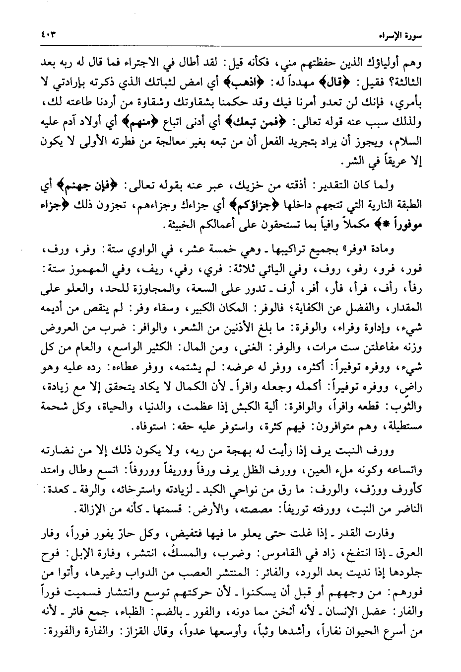 ومادة ( وفر ) بجميع تراكيبها - وهي خمسة عشر ، في الواوي ستة : وفر ، ورف ، فور ، فرو ، رفو ، روف ، وفي اليائي ثلاثة : فري ، رفي ، ريف ، وفي المهموز ستة : رفأ ، رأف ، فرأ ، فأر ، أفر ، أرف - تدور على السعة ، والمجاوزة للحد ، والعلو على المقدار ، والفضل عن الكفاية ؛ فالوفر : المكان الكبير ، وسقاء وفر : لم ينقص من أديمه شيء ، وإداوة وفراء ، والوفرة : ما بلغ الأذنين من الشعر ، والوافر : ضرب من العروض وزنه مفاعلتن ست مرات ، والوفر : الغنى ، ومن المال : الكثير الواسع ، والعام من كل شيء ، ووفره توفيراً : أكثره ، ووفر له عرضه : لم يشتمهن ووفر عطاءه : رده عليه وهو راضٍ ، ووفره توفيراً : أكمله وجعله وافراً - لأن الكمال لا يكاد يتحقق إلا مع زيادة ، والثوبك قطعة وافراً ، والوافرة : ألية الكبش إذا عظمت ، والدنيان والحياة ، وكل شحمة مستطلية ، وهم متوافرون : فيهم كثرة ، واستوفر عليه حقه : استوفاه .