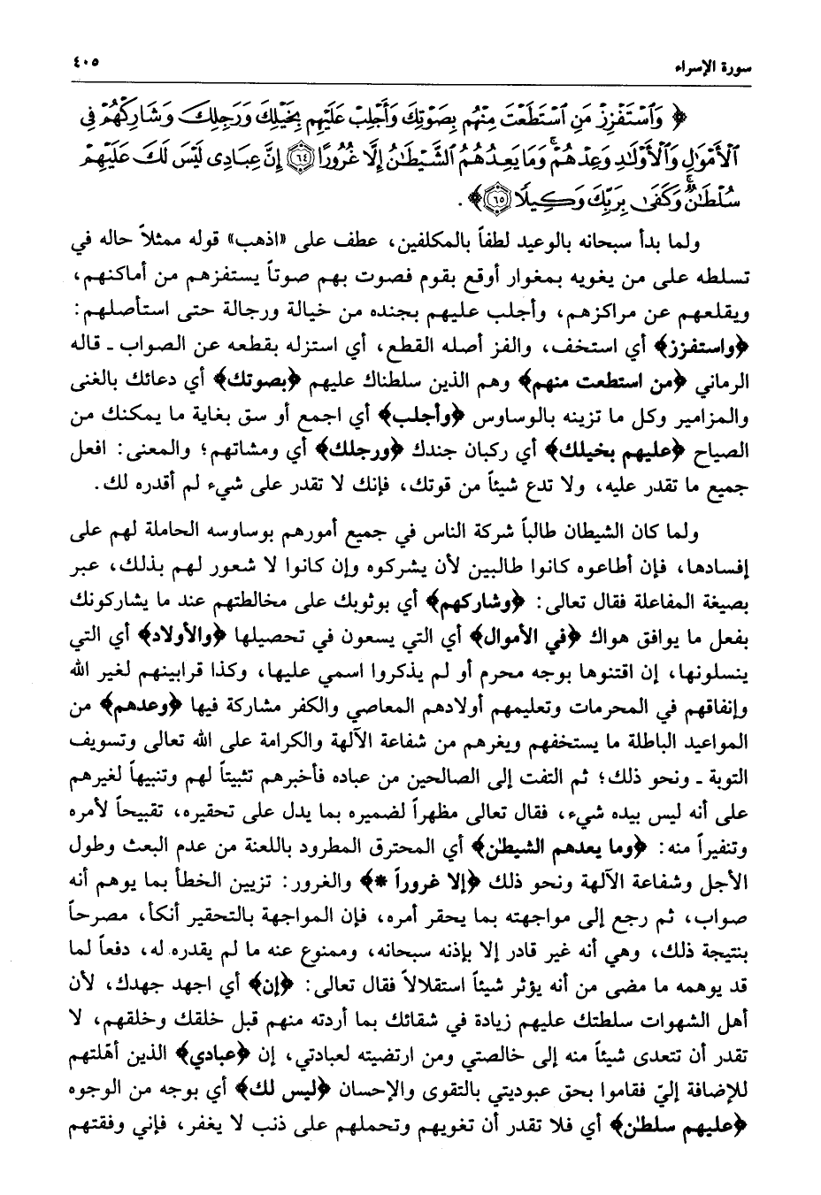 ) وَاسْتَفْزِزْ مَنِ اسْتَطَعْتَ مِنْهُمْ بِصَوْتِكَ وَأَجْلِبْ عَلَيْهِم بِخَيْلِكَ وَرَجِلِكَ وَشَارِكْهُمْ فِي الأَمْوَالِ وَالأَوْلادِ وَعِدْهُمْ وَمَا يَعِدُهُمُ الشَّيْطَانُ إِلاَّ غُرُوراً إِنَّ عِبَادِي لَيْسَ لَكَ عَلَيْهِمْ سُلْطَانٌ وَكَفَى بِرَبِّكَ وَكِيلاً ( ( )