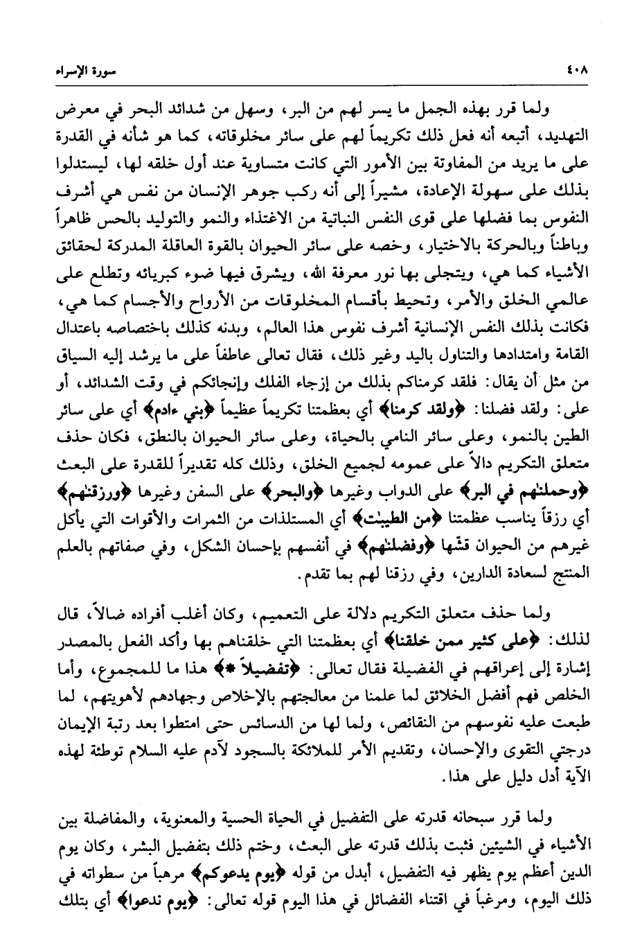 ولما حذف متعلق التكريم دلالة على التعميم ، وكان أغلب أفراده ضالاً ، قال لذلك : ( على كثير ممن خلقنا ) أي بعظمتنا التي خلقناهم بها وأكد الفعل بالمصدر إشارة إلى إعراقهم في الفضيلة فقال تعالى : ( تفضيلاً ( هذا ما للمجموع ، وأما الخلص فهم أفضل الخلائق لما علمنا من معالجتهم بالإخلاص وجهادهم لأهويتهم ، لما طبعت عليه نفوسهم من النقائص ، ولما لها من الدسائس حتى امتطوا بعد رتبة الإيمان درجتي التقوى والإحسان ، وتقديم الأمر للملائكة بالسجود لآدم عليه السلام توطئة لهذه الآية أدل دليل على هذا .