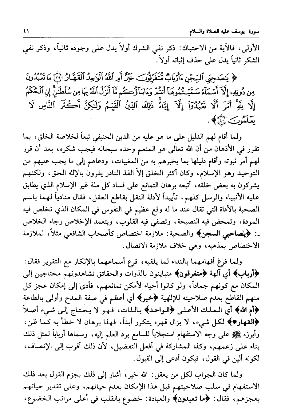 ) يصَاحِبَيِ السِّجْنِ أَأَرْبَابٌ مُّتَّفَرِّقُونَ خَيْرٌ أَمِ اللَّهُ الْوَاحِدُ الْقَهَّارُ مَا تَعْبُدُونَ مِن دُونِهِ إِلاَّ أَسْمَآءً سَمَّيْتُمُوهَآ أَنتُمْ وَآبَآؤُكُمْ مَّآ أَنزَلَ اللَّهُ بِهَا مِن سُلْطَانٍ إِنِ الْحُكْمُ إِلاَّ للَّهِ أَمَرَ أَلاَّ تَعْبُدُواْ إِلاَّ إِيَّاهُ ذلِكَ الدِّينُ الْقَيِّمُ وَلَكِنَّ أَكْثَرَ النَّاسِ لاَ يَعْلَمُونَ ( ( )