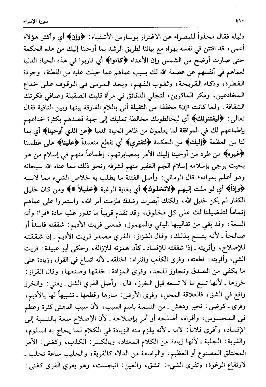 ولما كانت ( إن ) مخففة من الثقيلة أتى باللام الفارقة بينها وبين النافية فقال تعالى : ( ليفتنونك ) أي ليخالطونك مخالطة تمليك إلى جهة قصدكم بكثرة خداعهم بإطماعهم لك في الموافقة لما يعلمون من ظاهر الحياة الدنيا ) عن الذي أوحينا ) أي بما لنا من العظمة ) إليك ( من الحكمة ) لتفتري ) أي تقطع متعمداً ) علينا ( على عظمتنا ) غيره ( من طرد من أوحينا إليك الأمر بمصابرتهم ، إطماعاً منهم في إسلام من هو بحيث يرجى إسلامه إسلام الجم الغفير منهم لشرفه ونحو ذلك مما عناه الله سبحانه وهو أعلم بمراده ؛ قال الرماني : وأصل الفتنة ما يطلب به خلاص الشيء مما لابسه ) وإذا ) أي لو ملت إليهم ) لاتخذوك ) أي بغاية الرغبة ) خليلاً ( ومن كان خليل الكفار لم يكن خليل الله ، ولكنك أبصرت رشدك فلزمت أمر الله ، واستمروا على عماهم إتماماً لتفضيلنا لك على كل مخلوق ، وقد تقدم ما تدور عليه مادة ( فرا ) وأنه السعة ، وقد بقي من تقاليبها اليائي والمهموز ، فمعنى فريت الأديم : شققته فاسداً أو صالحاً - لأنه يتسع بذلك ، وقال القزاز : الفري مصدر فريت الأديم - إذا شققته للإصلاح ، وأفريته - إذا شققته للإفساد - كأن همزته للإزالة ، وحكى أبو عبيدة : فريت الشيء وأفريته : قطعته ، وفرى الكذب وافتراه : اختلفه - لأنه اتساع في القول وزيادة على ما يكفي من الصدق وتجاوز للحد ، وفرى المزادة : خلقها وصنعها ، وقال القزاز : خرزها - لأنها تسع ما لا تسعه قبل الخرز ، قال : وأصل الفري الشق - يعني : والخرز واقع في الشق ، فالعلاقة المحل ، وفرى الأرض : سارها وقطعها - تشبيهاً لها بالأديم ، وفرى - كرضي : تحير ودهش - من التسمية باسم السبب ، لأن سبب الدهش كثرة وعظم في المحسوس ، وأفراه ، أصلحه أو أمر بإصلاحه - لأن الإصلاح سعة بالنسبة إلى الإفساد ، وأفرى فلاناً : لامه - لأنه يلزم منه الزيادة في الكلام لما يحاج به الملوم ، والفرية : الجلبة - لأنها زيادة عن الكلام المعتاد ، وبالكسر : الكذب ، وكغنى : الأمر المختلق المصنوع أو العظيم ، والواسعة من الدلاء كالفرية ، والحليب ساعة تحلب - لارتفاع الرغوة ، وتفرى الشيء : انشق ، والعين : انبجست ، وهو يفري الفرى كغنى :