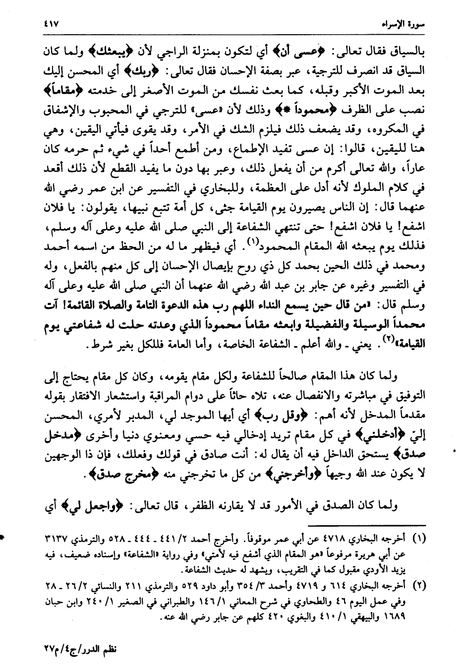 ولما كان هذا المقام صالحاً للشفاعة ولكل مقام يقومه ، وكان كل مقام يحتاج إلى التوفيق في مباشرته والانفصال عنه ، تلاه حاثاً على دوام المراقبة واستشعار الافتقار بقوله مقدماً المدخل لأنه أهم : ( وقل رب ) أي أيها الموجد لي ، المدبر لأمري ، المحسن إليّ ) أدخلني ( في كل مقام تريد إدخالي فيه حسي ومعنوي دنيا وأخرى ) مدخل صدق ( يستحق الداخل فيه أن يقال له : أنت صادق في قولك وفعلك ، فإن ذا الوجهين لا يكون عند الله وجيهاً ) وأخرجني ( من كل ما تخرجني منه ) مخرج صدق ( .