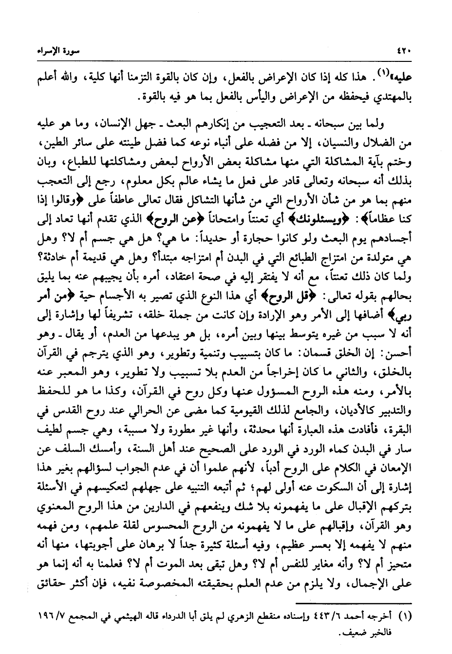 ولما بين سبحانه - بعد التعجيب من إنكارهم البعث - جهل الإنسان ، وما هو عليه من الضلال والنسيان ، إلا من فضله على أنباء نوعه كما فضل طينته على سائر الطين ، وختم بآية المشاكلة التي منها مشاكلة بعض الأرواح لبعض ومشاكلتها للطباع ، وبان بذلك أنه سبحانه وتعالى قادر على فعل ما يشاء عالم بكل معلوم ، رجع إلى التعجب منهم بما هو من شأن الأرواح التي من شأنها التشاكل فقال تعالى عاطفاً على ) وقالوا إذا كنا عظاماً ( : ( ويسئلونك ) أي تعنتاً وامتحاناً ) عن الروح ( الذي تقدم أنها تعاد إلى أجسادهم يوم البعث ولو كانوا حجارة أو حديداً : ماهي ؟ هل هي جسم أم لا ؟ وهل هي متولدة من امتزاج الطبائع التي في البدن أم امتزاجه مبتدأ ؟ وهل هي قديمة أم حادثة ؟ ولما كان ذلك تعنتاً ، مع أنه لا يفتقر إليه في صحة اعتقاده ، أمره بأن يجيبهم عنه بما يليق بحالهم بقوله تعالى : ( قل الروح ) أي هذا النوع الذي تصير به الأجسام حية ) من أمر ربي ( أضافها إلى الأمر وهو الإرادة وإن كانت من جملة خلقه ، تشريفاً لها وإشارة إلى أنه لا سبب من غيره يتوسط بينها وبين أمره ، بل هو يبدعها من العدم ، أو يقال - وهو أحسن : إن الخلق قسمان : ما كان بتسبيب وتنمية وتطوير ، وهو الذي يترجم في القرآن بالخلق ، والثاني ما كان إخراجاً من العدم بلا تسبيب ولا تطوير ، وهو المعبر عنه بالأمر ، ومنه هذه الروح المسؤول عنها وكل روح في القرآن ، وكذا ما هو للحفظ والتدبير كالأديان ، والجامع لذلك القيومية كما مضى عن الحرالي عند روح القدس في البقرة ، فأفادت هذه العبارة أنها محدثة ، وأنها غير مطورة ولامسببة ، وهي جسم لطيف سار في البدن كماء الورد في الورد على الصحيح عند أهل السنة ، وأمسك السلف عن الإمعان في الكلام على الروح أدباً ، لأنهم علموا أن في عدم الجواب لسؤالهم بغير هذا إشارة إلى أن السكوت عنه أولى لهم ؛ ثم أتبعه التنبيه على جهلهم لتعكيسهم في الأسئلة بتركهم الإقبال على ما لا يفهمونه بلا شك وينفعهم في الدارين من هذا الروح المعنوي وهوالقرآن ، وإقبالهم على ما لا يفهمونه من الروح المحسوس لقلة علمهم ، ومن فهمه منهم لا يفهمه إلا بعسر عظيم ، وفيه أسئلة كثيرة جداً لا برهان على أجوبتها ، منها أنه متحيز أم لا ؟ وأنه مغاير للنفس أم لا ؟ وهل تبقى بعد الموت أم لا ؟ فعلمنا به أنه إنما هو على الإجمال ، ولا يلزم من عدم العلم بحقيقته المخصوصة نفيه ، فإن أكثر حقائق