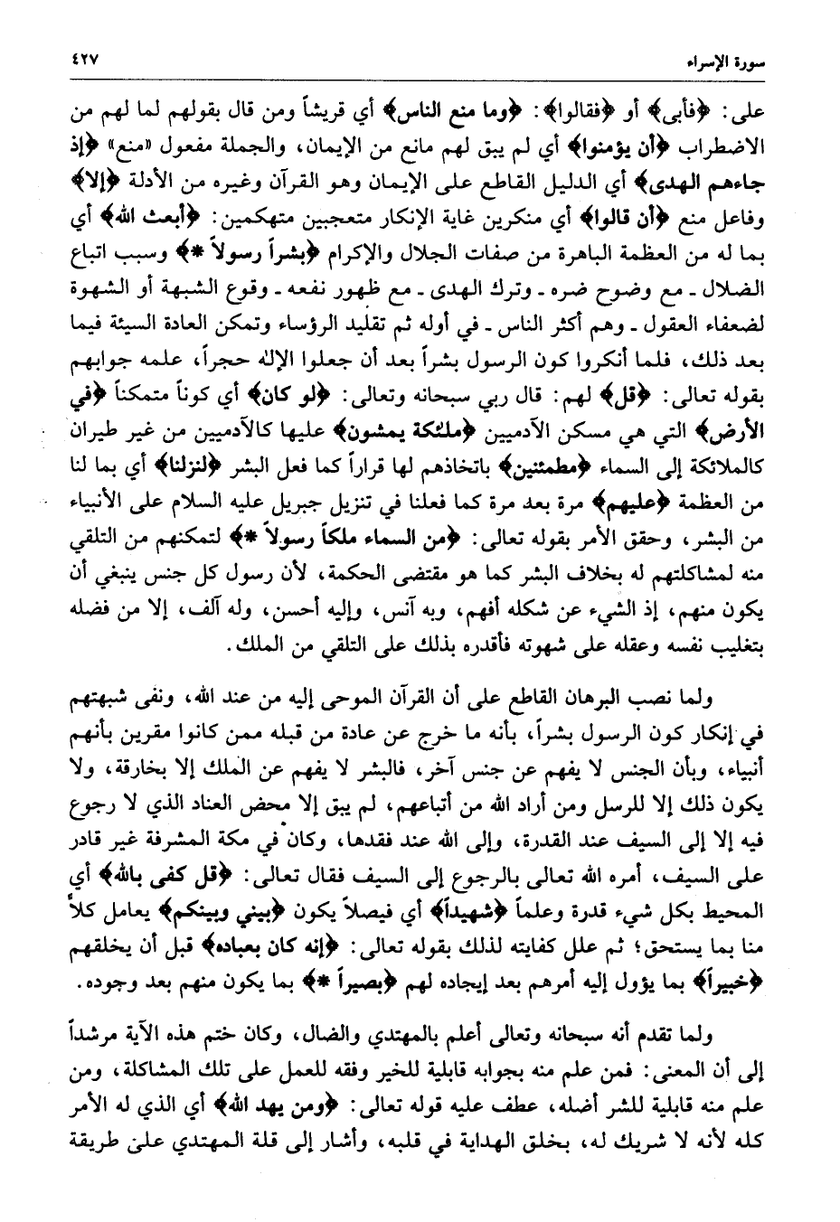 على : ( فأبى ( أو ) فقالوا ( : ( وما منع الناس ) أي قريشاَ ومن قال بقولهم لما لهم من الاضطراب ) أن يؤمنوا ) أي لم يبق لهم مانع من الإيمان ، والجملة مفعول ( منع ) ) إذ جاءهم الهدى ) أي الدليل القاطع على الإيمان وهو القرآن وغيره من الأدلة ) إلا ( وفاعل منع ) أن قالوا ) أي منكرين غاية الإنكار متعجبين متهكمين : ( أبعث الله ) أي بما له من العظمة الباهرة من صفات الجلال والإكرام ) بشراً ورسولاً ( وسبب اتباع الضلال - مع وضوح ضره - وترك الهدى - مع ظهور نفعه - وقوع الشبهة أو الشهوة بعد ذلك ، فلما أنكروا كون الرسول بشراً بعد أن جعلوا الإله حجراً ، علمه جوابهم بقوله تعالى : ( قل ( لهم : قال ربي سبحانه وتعالى : ( لو كان ) أي كوناً متمكناً ) في الأرض ( التي هي مسكن الآدميين ) ملائكة يمشون ( عليها كالآدميين من غير طيران كالملائكة إلى السماء ) مطمئنين ( باتخاذهم لها قراراً كما فعل البشر ) لنزلنا ) أي بما لنا من العظمة ) عليهم ( مرة بعد مرة كما فعلنا في تنزيل جبريل عليه السلام على الأنبياء من البشر ، وحقق الأمر بقوله تعالى : ( من السماء ملكاً رسولاً ( لتمكنهم من التلقي منه لمشاكلتهم لع بخلاف البشر كما هو مقتضي الحكمة ، لأن رسول كل جنس ينبغي أن يكون منهم ، إذ الشيء عن شكله أفهم ، وبه آنس ، وإليه أحسن ، وله آلف ، إلا من فضله بتغليب نفسه وعقله على شهوته فأقدره بذلك على التلقي من الملك .
