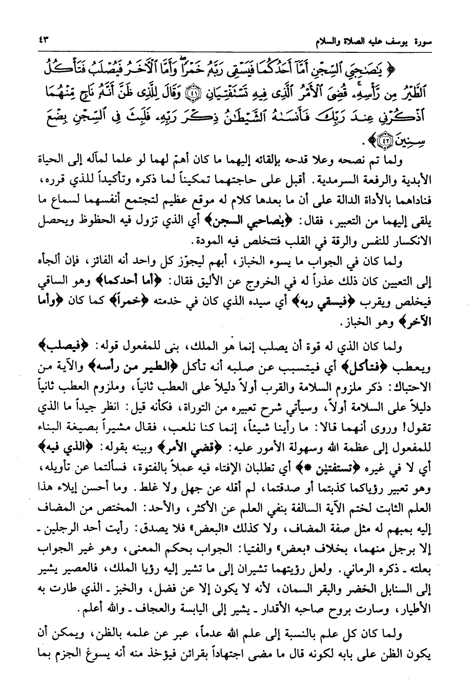 ) يصَاحِبَيِ السِّجْنِ أَمَّآ أَحَدُكُمَا فَيَسْقِي رَبَّهُ خَمْراً وَأَمَّا الآخَرُ فَيُصْلَبُ فَتَأْكُلُ الطَّيْرُ مِن رَّأْسِهِ قُضِيَ الأَمْرُ الَّذِي فِيهِ تَسْتَفْتِيَانِ وَقَالَ لِلَّذِي ظَنَّ أَنَّهُ نَاجٍ مِّنْهُمَا اذْكُرْنِي عِندَ رَبِّكَ فَأَنْسَاهُ الشَّيْطَانُ ذِكْرَ رَبِّهِ فَلَبِثَ فِي السِّجْنِ بِضْعَ سِنِينَ ( ( )