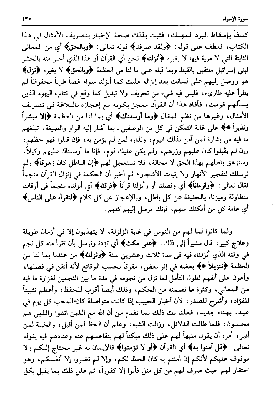 كسفاً بإسقاط البرد المهلك ، فثبت بذلك صحة الإخبار بتصريف الأمثال في هذا الكتاب ، فعطف على قوله : ( ولقد صرفنا ( قوله تعالى : ( وبالحق ) أي من المعاني الثابتة التي لا مرية فيها لا بغيره ) أنزلناه ( نحن القرآن أو هذا الذي أخبر منه بالحشر لبني إسرائيل ملتفين بالقبط وبما قبله على ما لنا من العظمة ) وبالحق ( لا بغيره ) نزل ( هو ووصل إليهم على لسانك بعد إنزاله عليك كما أنزلنا سواء غضاً طرياً محفوظاً لهم يطرأ عليه طارئ ، فليس فيه شيء من تحريف ولا تبديل كما وقع في كتاب اليهود الذين يسألهم قومك ، فأفاد هذا أن القرآن معجز بكونه مع إعجازه بالبلاغة في تصريف الأمثال ، وغيرها من نظم المقال ) وما أرسلناك ) أي بما لنا من العظمة ) إلا مبشراً ونذيراً ( على غاية التمكن في كل من الوصفين - بما أشار إليه الواو والصيغة ، تبلغهم ما فيه من بشارة لمن آمن بذلك اليوم ، ونذارة لمن لم يؤمن به ، فإن قبلوا فهو حظهم ، وإن لم يقبلوا كان عليهم وزرهم ، ولم يكن عليك لوم ، فإنا ما أرسلناك عليهم وكيلاً ، وسنزهق باطلهم بهذا الحق لا محالة ، فلا تستعجل لهم ) إن الباطل كان زهوقاً ( ولم نرسلك لتفجير الأنهار ولا إنبات الأشجار ؛ ثم أخبر أن الحكمة في إنزال القرآن منجماً فقال تعالى : ( وقرءاناً ) أي وفصلنا أو أنزلنا قرآناً ) فرقناه ) أي أنزلنا منجماً في أوقات متطاولة وميزناه بالحقيقة عن كل باطل ، وبالإعجاز عن كل كلام ) لتقرأه على الناس ) أي عامة كل من أمكنك منهم ، فإنك مرسل إليهم كلهم .
