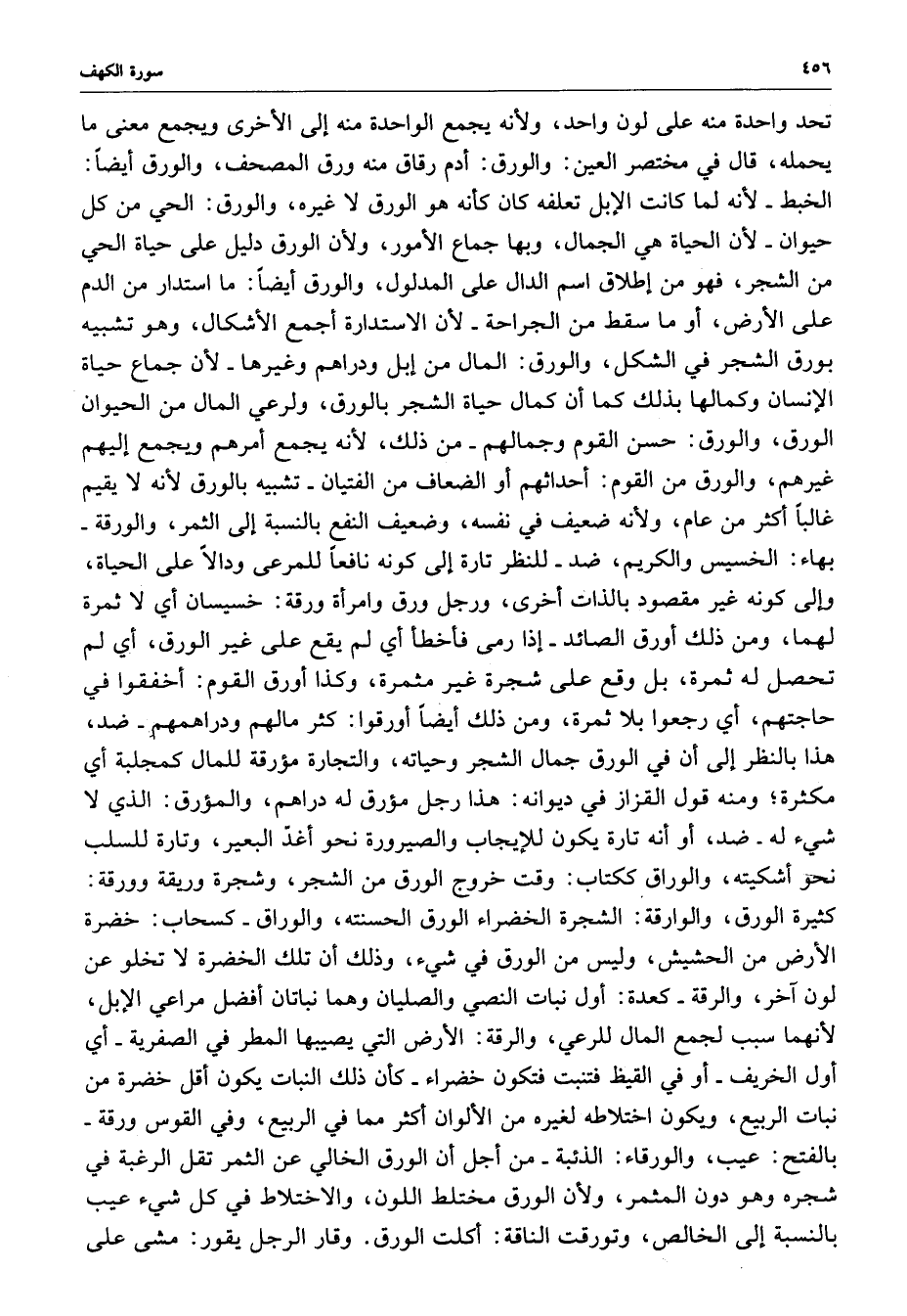 تحد واحدة منه على لون واحد ، ولأنه يجمع الواحدة منه إلى الأخرى ويجمع معنى ما يحمله ، قال في مختصر العين : والورق : أدم رقاق منه ورق المصحف ، والورق أيضاً : الخبط - لأنه لما كانت الإبل تعلفه كان كأنه هو الورق لا غيره ، والورق : الحي من كل حيوان - لأن الحياة هي الجمال ، وبها جماع الأمور ، ولأن الورق دليل على حياة الحي من الشجر ، فهو من إطلاق اسم الدال على المدلول ، والورق أيضاً : ما استدر من الدم على الأرض ، أو ما سقط اسم من الجراحة - لأن الاستدارة أجمع الأشكال ، وهو تشبيه بورق الشجر في الشكل ، والورق : المال من إبل ودارهم وغيرها - لأن جماع حياة الإنسان وكمالها بذلك كما أن كمال حياة الشجر بالورق ، ولرعي المال من الحيوان الورق والورق : حسن القوم وجمالهم - من ذلك ، لأنه يجمع أمرهم ويجمع إليهم غيرهم ، والورق من القوم : أحداثهم أو الضعاف من الفتيان - تشبيه بالورق لأنه لا يقيم غالباً أكثر من عام ، ولأنه ضعيف في نفسه ، وضعيف النفع بالنسبة إلى الثمر ، والورقة - بهاء : الخسيس والكريم ، ضد - للنظر تارة إلى كونه نافعاً للمرعى ودالاً على الحياة ، وإلى كونه غير مقصود بالذات أخرى ، ورجل ورق وامرأة ورقة : خسيسان أي لا ثمرة لهما ، ومن ذلك أورق الصائد - إذا رمى فأخطأ أي لم يقع على غير الورق ، أي لم تحصل له ثمرةن بل وقع على شجرة غير مثمرة ، وكذا أوراق القوم : أخفقوا في حاجتهم ، أي رجعوا بلا ثمرة ، ومن ذلك أيضاً أورقوا : كثرمالهم ودراهمهم - ضد ، هذا بالنظر إلى أن في الورق جمال الشجر وحياته ، والتجارة مؤرقة للمال كمجلبة أي مكثرة ؛ ومنه قول القزاز في ديوانه : هذا رجل مؤرق له دراهمن والمؤرق : الذي لا شيء له - ضد أو أنه تارة يكون للإيجاب والصيرورة نحو أغدّ البعير ، وتارة للسلب نحو أشكيته ، والوراق ككتاب : وقت خروج الورق من الشجر ، وشجرة وريقة وورقة : كثيرة الورق ، والوراقة : الشجرة الخضراء الورق الحسنته ، والوراق - كسحاب : خضرة الأرض من الحشيش ، وليس من الورق في شيء ، وذلك أن تلك الخضرة لا تخلو عن لون آخر ، والرقة - كعدة : أول نبات النصي والصليان وهما نباتان أفضل مراعي الإبل ، لأنهما سبب لجمع المال للرعي ، والرقة : الأرض التي يصيبها المطر في الصفرية - أي أول الخريف - أو في القيظ فتنبت فتكون خضراء - كأن ذلك النبات يكون أقل خضرة من نبات الربيع ، ويكون اختلاطه لغيره من الألوان أكثر مما في الربيع ، وفي القوس ورقة - بالفتح : عيب ، والورقاء : الذئبة - من أجل أن الورق الخالي عن الثمر تقل الرغبة في شجره وهو دون المثمر ، ولأن الورق مختلط اللون ، والاختلاط في كل شيء عيب بالنسبة إلى الخالص ، وتورقت الناقة : أكلت الورق .