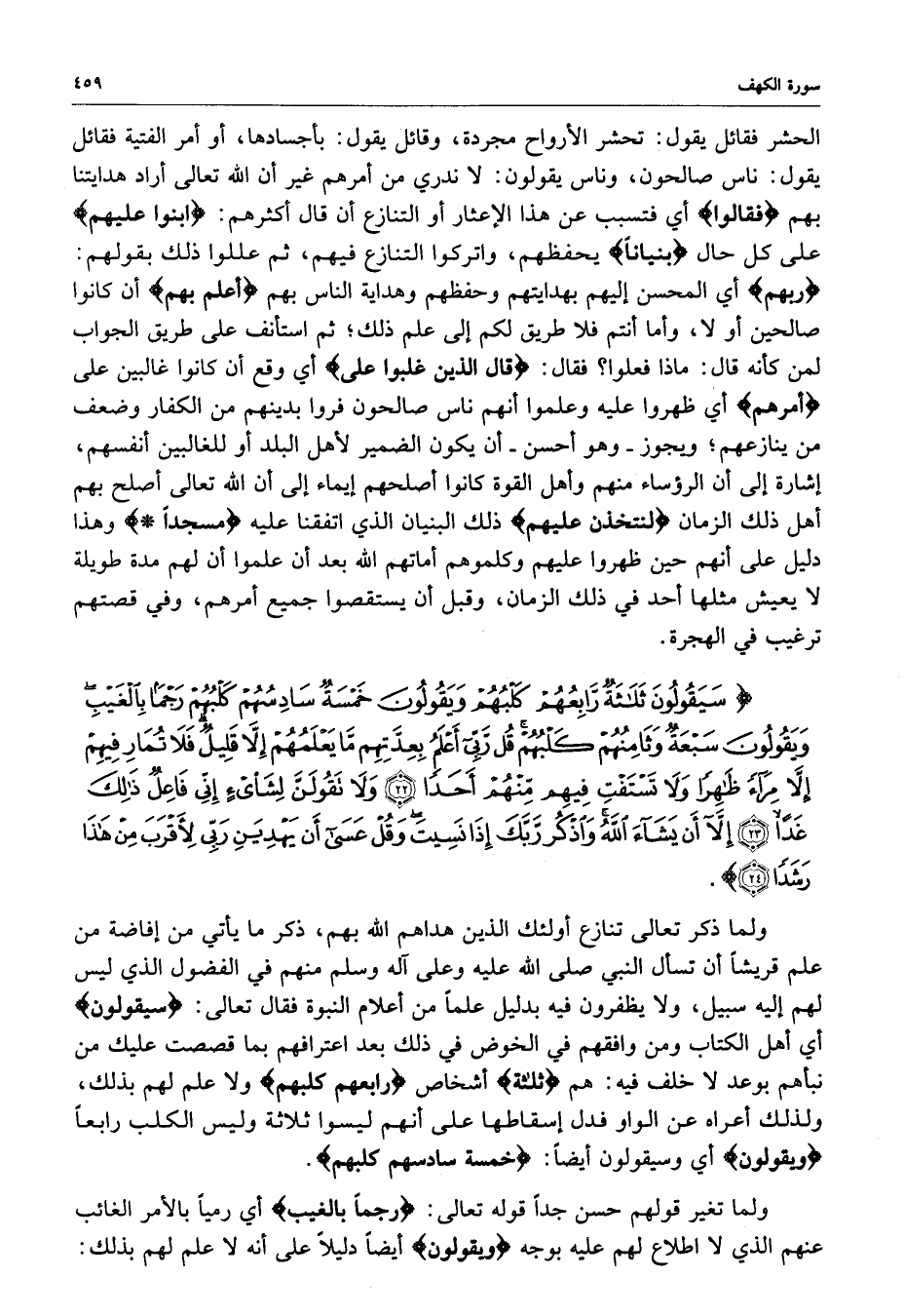 الحشر فقائل يقول : تحشر الأرواح مجردة : وقائل يقول : بأجسادها ، أو أمر الفتية فقائل يقول : ناس صالحون ، وناس يقولون : لا ندري من أمرهم غير أن الله تعالى أراد هدايتنا بهم ) فقالوا ) أي فتسبب عن هذا الإعثار أو التنازع أن قال أكثرهم : ( ابنوا عليهم ( على كل حال ) بنياناً ( يحفظهم ، واتركوا التنازع فيهم ، ثم عللوا ذلك بقولهمك ) ربهم ) أي المحسن إليهم بهدايتهم وحفظهم وهداية الناس بهم ) أعلم بهم ( أن كانوا صالحين أو لا ، وأما أنتم فلا طريق لكم إلى علم ذلك ؛ ثم استأنف على طريق الجواب لمن كأنه قال : ماذا فعلوا ؟ فقال : ( قال الذين غلبوا على ) أي وقع أن كانوا غالبين على ) أمرهم ) أي ظهروا عليه و علموا أنهم ناس صالحون فروا بدينهم من الكفار وضعف من ينازعهم ؛ ويجوز - وهو أحسن - أن يكون الضمير لأهل البلد أو للغالبين أنفسهم ، إشارة إلى أن الرؤساء منهم وأهل القوة كانوا أصلحهم إيماء إلى أن الله تعالى أصلح بهم أهل ذلك الزمان ) لنتخذن عليهم ( ذلك البيان الذي اتفقنا عليه ) مسجداً ( وهذا دليل على أنهم حين ظهروا عليهم وكلموهم أماتهم الله بعد أن علموا أن لهم مدة طويلة لا يعيش مثلها أحد في ذلك الزمان ، وقبل أن يستقصوا جميع أمرهم ، وفي قصتهم ترغيب في الهجرة .