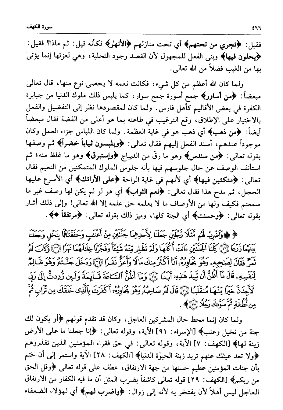 ) وَاضْرِبْ لهُمْ مَّثَلاً رَّجُلَيْنِ جَعَلْنَا لأَحَدِهِمَا جَنَّتَيْنِ مِنْ أَعْنَابٍ وَحَفَفْنَاهُمَا بِنَخْلٍ وَجَعَلْنَا بَيْنَهُمَا زَرْعاً كِلْتَا الْجَنَّتَيْنِ آتَتْ أُكُلَهَا وَلَمْ تَظْلِمِ مِّنْهُ شَيْئاً وَفَجَّرْنَا خِلالَهُمَا نَهَراً وَكَانَ لَهُ ثَمَرٌ فَقَالَ لَصَاحِبِهِ وَهُوَ يُحَاوِرُهُ أَنَا أَكْثَرُ مِنكَ مَالاً وَأَعَزُّ نَفَراً وَدَخَلَ جَنَّتَهُ وَهُوَ ظَالِمٌ لِّنَفْسِهِ قَالَ مَآ أَظُنُّ أَن تَبِيدَ هَذِهِ أَبَداً وَمَآ أَظُنُّ السَّاعَةَ قَائِمَةً وَلَئِن رُّدِدتُّ إِلَى رَبِّي لأَجِدَنَّ خَيْراً مِّنْهَا مُنْقَلَباً قَالَ لَهُ صَاحِبُهُ وَهُوَ يُحَاوِرُهُ أَكَفَرْتَ بِالَّذِي خَلَقَكَ مِن تُرَابٍ ثُمَّ مِن نُّطْفَةٍ ثُمَّ سَوَّاكَ رَجُلاً ( ( )
