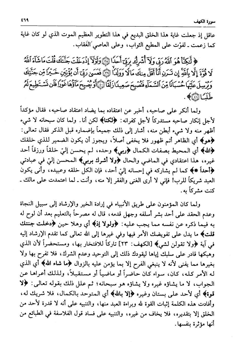 ) لَّكِنَّ هُوَ اللَّهُ رَبِّي وَلاَ أُشْرِكُ بِرَبِّي أَحَداً وَلَوْلا إِذْ دَخَلْتَ جَنَّتَكَ قُلْتَ مَا شَآءَ اللَّهُ لاَ قُوَّةَ إِلاَّ بِاللَّهِ إِن تَرَنِ أَنَاْ أَقَلَّ مِنكَ مَالاً وَوَلَداً فعسَى رَبِّي أَن يُؤْتِيَنِ خَيْراً مِّن جَنَّتِكَ وَيُرْسِلَ عَلَيْهَا حُسْبَاناً مِّنَ السَّمَآءِ فَتُصْبِحَ صَعِيداً زَلَقاً أَوْ يُصْبِحَ مَآؤُهَا غَوْراً فَلَن تَسْتَطِيعَ لَهُ طَلَباً ( ( )
