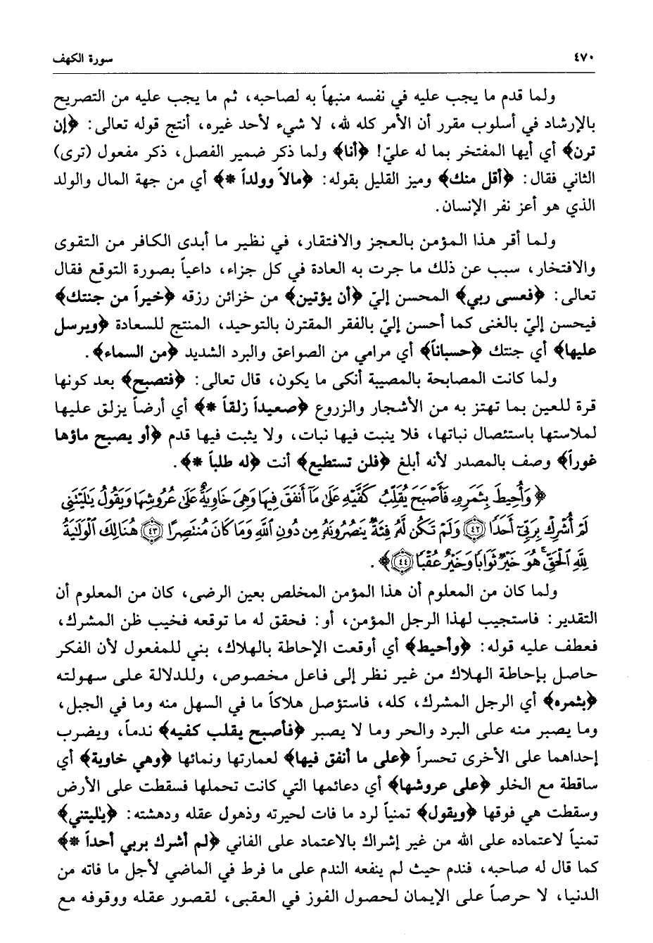 ) وَأُحِيطَ بِثَمَرِهِ فَأَصْبَحَ يُقَلِّبُ كَفَّيْهِ عَلَى مَآ أَنْفَقَ فِيهَا وَهِيَ خَاوِيَةٌ عَلَى عُرُوشِهَا وَيَقُولُ يلَيْتَنِي لَمْ أُشْرِكْ بِرَبِّي أَحَداً وَلَمْ تَكُن لَّهُ فِئَةٌ يَنصُرُونَهُ مِن دُونِ اللَّهِ وَمَا كَانَ مُنْتَصِراً هُنَالِكَ الْوَلاَيَةُ لِلَّهِ الْحَقِّ هُوَ خَيْرٌ ثَوَاباً وَخَيْرٌ عُقْباً ( ( )
