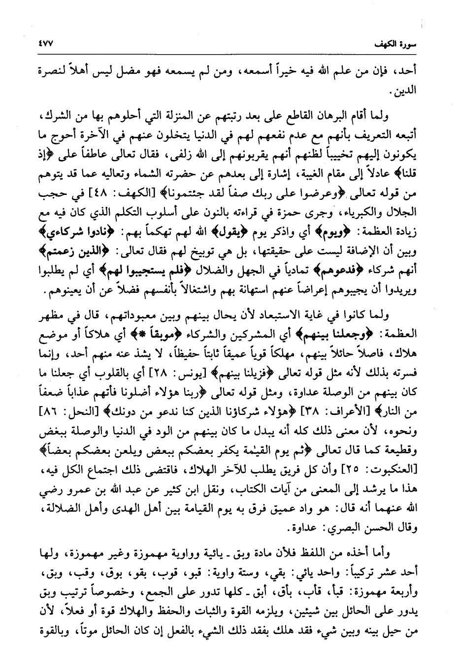 [ الكهف : 48 ] في حجب الجلال والكبرياء ، وجرى حمزة في قراءته بالنون على أسلوب التكلم الذي كان فيه مع زيادة العظمة : ( ويوم ) أي واذكر يوم ) يقول ( الله لهم تهكماً بهم : ( نادوا شركاءي ( وبين أن الإضافة ليست على حقيقتها ، بل هي توبيخ لهم فقال تعالى : ( الذين زعمتم ( أنهم شركاء ) فدعوهم ( تمادياً في الجهل والضلال ) فلم يستجيبوا لهم ) أي لم يطلبوا ويريدوا أن يجيبوهم إعراضاً عنهم استهانة بهم واشتغالاً بأنفسهم فضلاً عن أن يعينوهم .