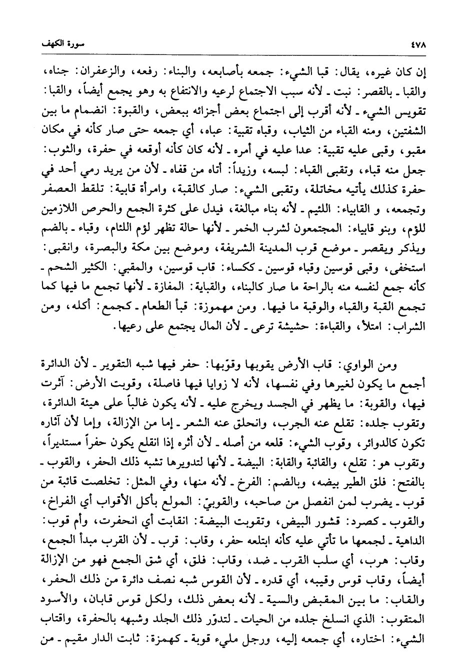 ومن الواوي : قاب الأرض يقوبها وقوّبها : حفر فيها شبه التقوير - لأن الدائرة أجمع ما يكون لغيرها وفي نفسها ، لأنه لا زوايا فيها فاصلة ، وقوبت الأرض : آثرت فيها ، والقوبة : ما يظهر في الجسد ويخرج عليه - لأنه يكون غالباً على هيئة الدائرة ، وتقوب جلده : تقلع عنه الجرب ، وانحلق عنه الشعر - إما من الإزالة ، وإما لأن آثاره تكون كالدوائر ، وقوب الشيء : قلعه من أصله - لأن أثره إذا انقلع يكون حفراً مستديراً ، وتقوب هو : تقلع ، والقائبة والقابة : البيضة - لأنها لتدويرها تشبه ذلك الحفر ، والقوب - بالفتح : فلق الطير بيضه ، وبالضم : الفرخ - لأنه منها ، وفي المثل : تخلصت قائبة من قوب - يضرب لمن انفصل من صاحبهن والقوبيّ : المولع بأكل الأقواب أي الفراخ ، والقوب - كصرد : قشور البيض ، وتقوبت البيضه : انقابت أي انحفرت ، وأم قوب : الداهية - لجمعها ما تأتي عليه كأنهه ابتلعه حفر ، وقاب : قرب - لأن القرب مبدأ الجمع ، وقاب : هرب ، أي سلب القرب - ضد ، وقاب : فلق ، أي شق الجمع فهو من الإزالة أيضاً ، وقاب قوس وقيبه ، أي قدره - لأن القوس شبه نصف دائرة من ذلك الحفر ، والقاب : ما بين المقبض والسية - لأنه بعض ذلك ، ولك قوس قابان ، والأسود المتقوب : الذي انسلخ جلده من الحيات - لتدوّر ذلك الجلد وشبهه بالحفرة ، واقتاب الشيء : اختاره ، أي جمعه إليه ، ورجل مليء قوبة - كهمزة : ثابت الدار مقيم - من