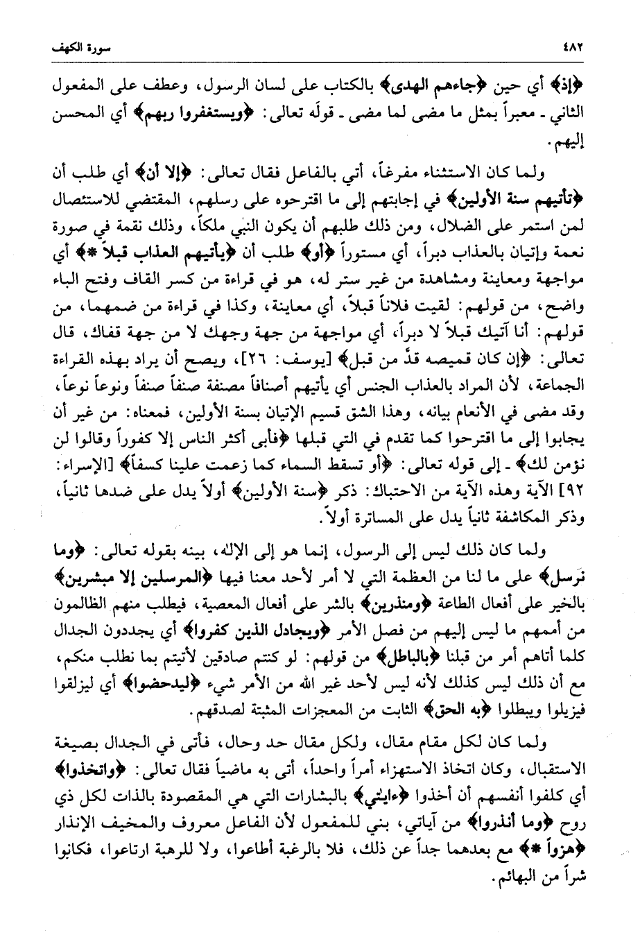 ولما كان الاستثناء مفرغاً ، أتى بالفاعل فقال تعالى : ( إلا أن ) أي طلب أن ) تأتيهم سنة الأولين ( في إجابتهم إلى ما اقترحوه على رسلهم ، المقتضي للاستئصال لمن استمر على الضلال ، ومن ذلك طلبهم أن يكون النبي ملكاً ، وذلك نقمة في صورة نعمة وإتيان بالعذاب دبراً ، أي مستوراً ) أو ( طلب أن ) يأتيهم العذاب قبلاً ) أي مواجهة ومعاينة ومشاهدة من غير ستر له ، هو في قراءة من كسر القاف وفتح الباء واضح ، من قولهم : لقيت فلاناً قبلاً ، أي معاينة ، وكذا في قراءة من ضمهما ، من قولهم : أنا آيتك قبلاً لا دبراً ، أي مواجهة من جهة وجهك لا من جهة قفاك ، قال تعالى :