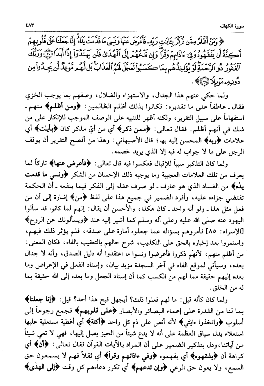 ) وَمَنْ أَظْلَمُ مِمَّن ذُكِّرَ بِآيِاتِ رَبِّهِ فَأَعْرَضَ عَنْهَا وَنَسِيَ مَا قَدَّمَتْ يَدَاهُ إِنَّا جَعَلْنَا عَلَى قُلُوبِهِمْ أَكِنَّةً أَن يَفْقَهُوهُ وَفِي آذَانِهِمْ وَقْراً وَإِن تَدْعُهُمْ إِلَى الْهُدَى فَلَنْ يَهْتَدُواْ إِذاً أَبَداً وَرَبُّكَ الْغَفُورُ ذُو الرَّحْمَةِ لَوْ يُؤَاخِذُهُم بِمَا كَسَبُواْ لَعَجَّلَ لَهُمُ الْعَذَابَ بَل لَّهُم مَّوْعِدٌ لَّن يَجِدُواْ مِن دُونِهِ مَوْئِلاٍ ( ( )