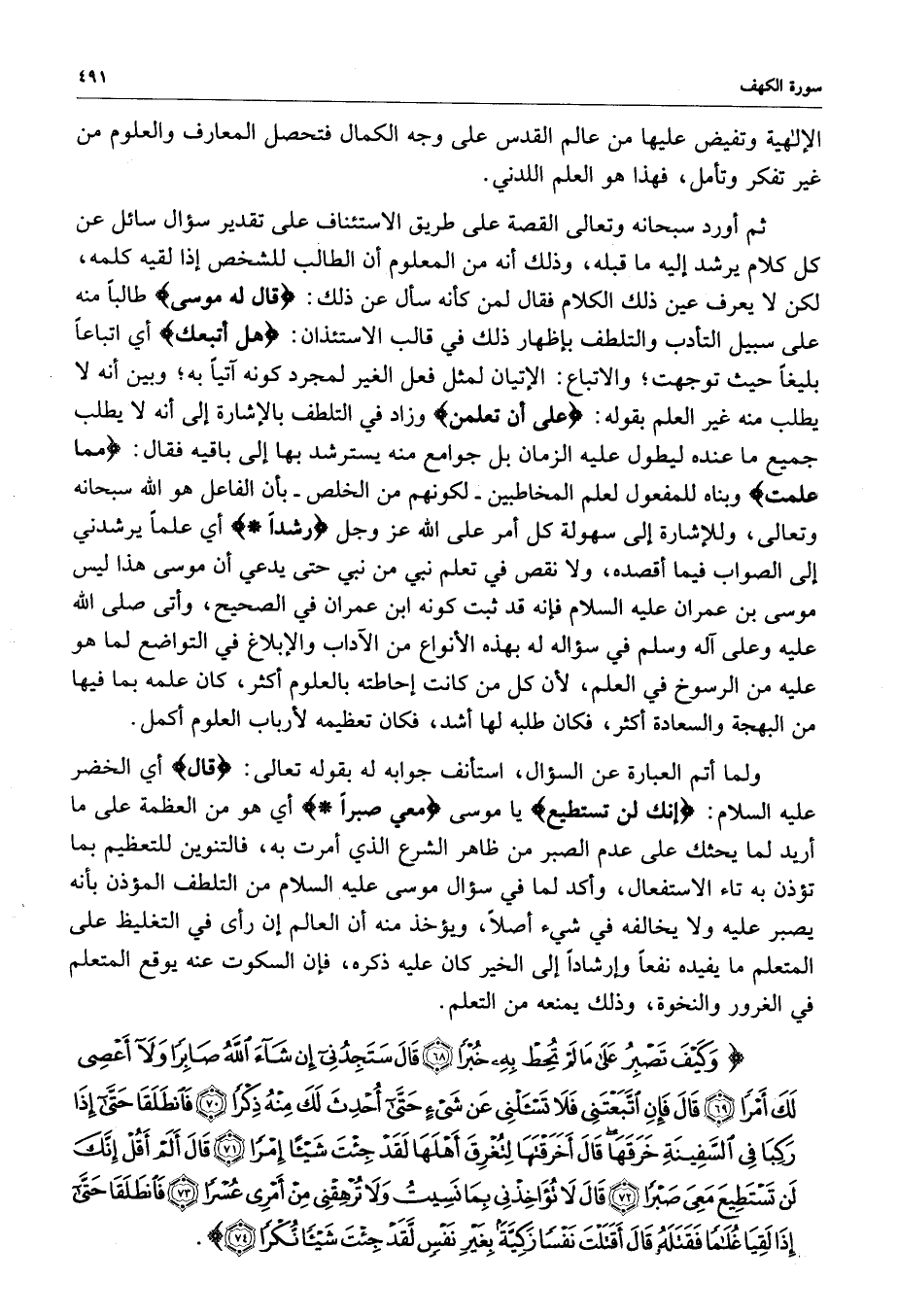 ) وَكَيْفَ تَصْبِرُ عَلَى مَا لَمْ تُحِطْ بِهِ خُبْراً قَالَ سَتَجِدُنِي إِن شَآءَ اللَّهُ صَابِراً وَلاَ أَعْصِي لَكَ أمْراً قَالَ فَإِنِ اتَّبَعْتَنِي فَلاَ تَسْأَلْني عَن شَيءٍ حَتَّى أُحْدِثَ لَكَ مِنْهُ ذِكْراً فَانْطَلَقَا حَتَّى إِذَا رَكِبَا فِي السَّفِينَةِ خَرَقَهَا قَالَ أَخَرَقْتَهَا لِتُغْرِقَ أَهْلَهَا لَقَدْ جِئْتَ شَيْئاً إِمْراً قَالَ أَلَمْ أَقُلْ إِنَّكَ لَن تَسْتَطِيعَ مَعِيَ صَبْراً قَالَ لاَ تُؤَاخِذْنِي بِمَا نَسِيتُ وَلاَ تُرْهِقْنِي مِنْ أَمْرِي عُسْراً فَانْطَلَقَا حَتَّى إِذَا لَقِيَا غُلاَماً فَقَتَلَهُ قَالَ أَقَتَلْتَ نَفْساً زَكِيَّةً بِغَيْرِ نَفْسٍ لَّقَدْ جِئْتَ شَيْئاً نُّكْراً ( ( )