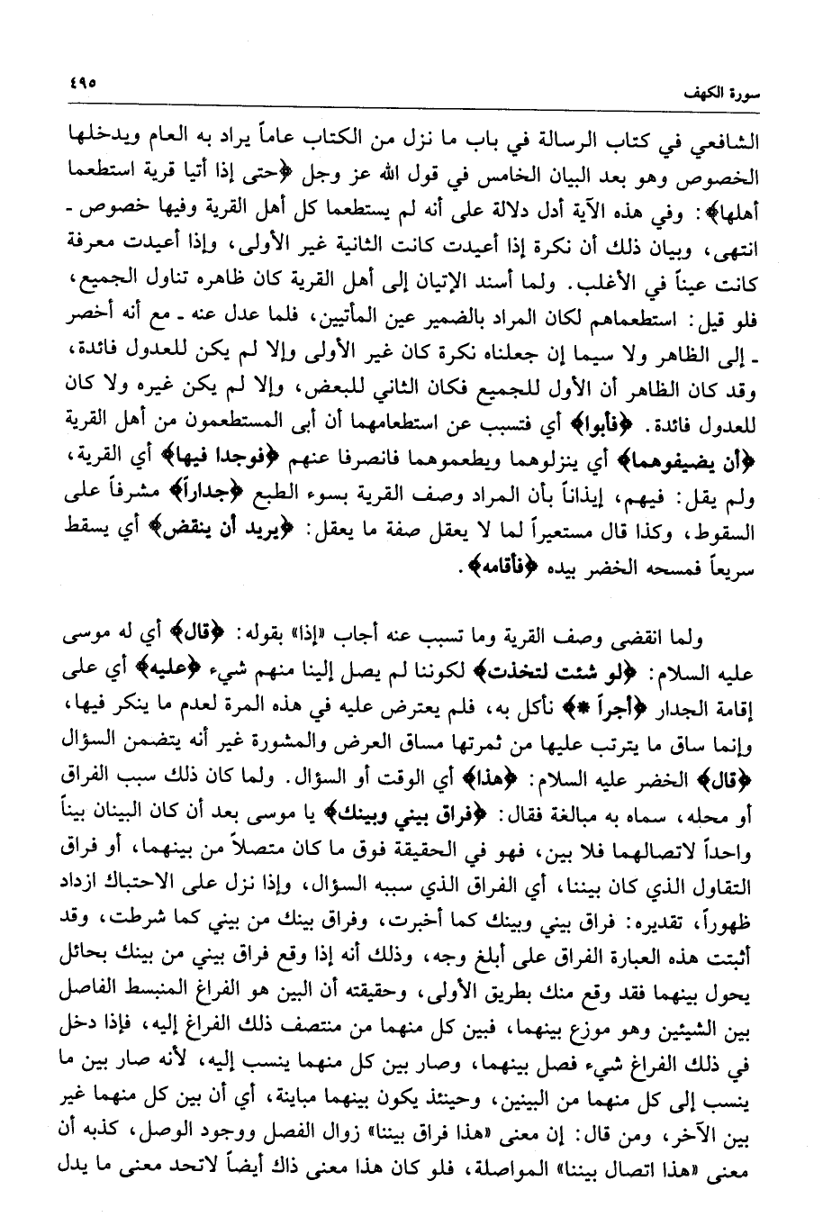 الشافعي في كتاب الرسالة في باب ما نزل من الكتاب عاماً يراد به العام ويدخلها الخصوص وهو بعد البيان الخامس في قول عز وجل ) حتى إذا أتيا قرية استطعما أهلها ( : وفي هذه الآية أدل دلالة على أنه لم يستطعما كل أهل القرية وفيها خصوص - انتهى ، وبيان ذلك أن نكرة إذا أعيدت كانت الثانية غير الأولى ، وإذا أعيدت معرفة كانت عيناً في الأغلب .