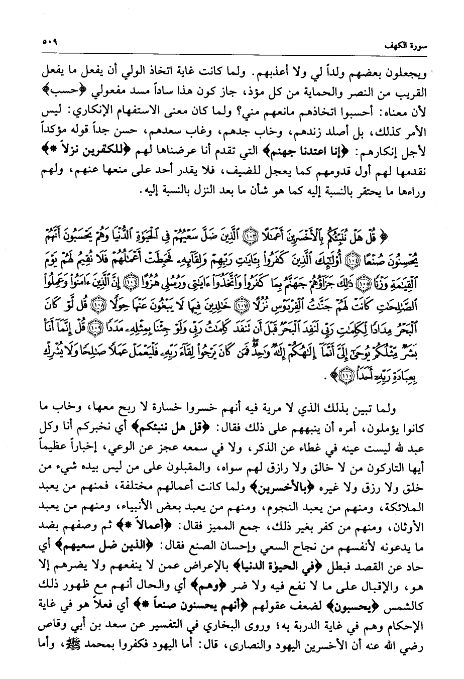 ) قُلْ هَلْ نُنَبِّئُكُم بِالأَخْسَرِينَ أَعْمَالاً الَّذِينَ ضَلَّ سَعْيُهُمْ فِي الْحَيَاةِ الدُّنْيَا وَهُمْ يَحْسَبُونَ أَنَّهُمْ يُحْسِنُونَ صُنْعاً أُوْلَئِكَ الَّذِينَ كَفَرُواْ بِآيَاتِ رَبِّهِمْ وَلِقَائِهِ فَحَبِطَتْ أَعْمَالُهُمْ فَلاَ نُقِيمُ لَهُمْ يَوْمَ الْقِيَامَةِ وَزْناً ذَلِكَ جَزَآؤُهُمْ جَهَنَّمُ بِمَا كَفَرُواْ وَاتَّخَذُواْ آيَاتِي وَرُسُلِي هُزُواً إِنَّ الَّذِينَ آمَنُواْ وَعَمِلُواْ الصَّالِحَاتِ كَانَتْ لَهُمْ جَنَّاتُ الْفِرْدَوْسِ نُزُلاً خَالِدِينَ فِيهَا لاَ يَبْغُونَ عَنْهَا حِوَلاً قُل لَّوْ كَانَ الْبَحْرُ مِدَاداً لِّكَلِمَاتِ رَبِّي لَنَفِدَ الْبَحْرُ قَبْلَ أَن تَنفَدَ كَلِمَاتُ رَبِّي وَلَوْ جِئْنَا بِمِثْلِهِ مَدَداً قُلْ إِنَّمَآ أَنَاْ بَشَرٌ مِّثْلُكُمْ يُوحَى إِلَيَّ أَنَّمَآ إِلَهُكُمْ إِلَهٌ وَاحِدٌ فَمَن كَانَ يَرْجُو لِقَآءَ رَبِّهِ فَلْيَعْمَلْ عَمَلاً صَالِحاً وَلاَ يُشْرِكْ بِعِبَادَةِ رَبِّهِ أَحَدَا ( ( )