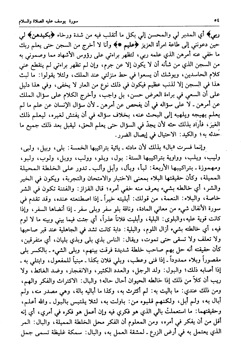 وإنما فسرت ( بال ) بذلك لأن مادته - يائية بتراكيبها الخمسة : بلى ، وبيل ، ولبى ، وليب ، ويلب ، وواوية بتراكيبها الستة : بول ، وبلو ، وولب ، ووبل ، ولوب ، ولبو ، ومهموزة - بتراكيبها الأربعة : لبأ ، وبأل ، وأبل وألب - تدور على الخلطة المحيلة المميلة ، وكأن حقيقتها البلاء بمعنى الاختبار والامتحان والتجربة ، ويكون في الخير والشر ، أي خالطه بشيء يعرف منه خفي أمره ؛ قال القزاز : والفتنة تكون في الشر خاصة ، والبلاء : النعمة ، من قولك : أبليته خيراً - إذا اصطنعته عنده ، وقد تقدم في سورة الأنفال شيء من معاني المادة ، وناقة بلو سفر وبلى سفر - إذا أنضاها السفر ، وإذا كانت قوية عليه ، والبلوى : البلية ، وأبليت فلاناً عذراً ، أي جئت فيما بيني وبينه ما لا لوم فيه ، أي خالطته بشيء أزال اللوم ، والبلية : دابة كانت تشد في الجاهليةة عند قبر صاحبها ولا تعلف ولا تسقي حتى تموت ، ويقال : الناس بذي بلى وبذي بليان ، أي متفرقين ، كأن حقيقته أنه حل بهم صاحب خلطة شديدة فرقت بينهم ، وبلى الشيء - بالكسر بلى مقصوراً وبلاء ممدوداً - إذا فنى وعطب ، وبلى فلان بكذا - مبيناً للمفعول ، وابتلى به - إذا أصابه ذلك ؛ والبول : ولد الرجل ، والعدد الكثير ، والانفجار ، وضد الغائط ، ولا ريب أن كلاً من ذلك إذا خالطه الحيوان أحال حاله ؛ والبال : الاكتراث والفكروالهم ، ومن ذلك عندي : ما باليت به : لم أكترث به ، وكذا ما أباليه بالة ، وهي مصدر منه ، ولم أبال به ، ولم أبل ، ولكنهم قلبوه من : باولت به ، لئلا يلتبس بالبول - والله أعلم ، وحقيقتهما : ما استعملتُ بالي الذي هو فكري فيه وإن أعمل هو فكره في أمري ، أي إنه أقل من أن يفكر في أمره ، ومن المعلوم أن الفكر محل الخلطة المميلة ، والبال : المر الذي يعتم به في أرض الزرع - لمشقة العمل به ، والبال : سمكة غليظة تسمى جمل