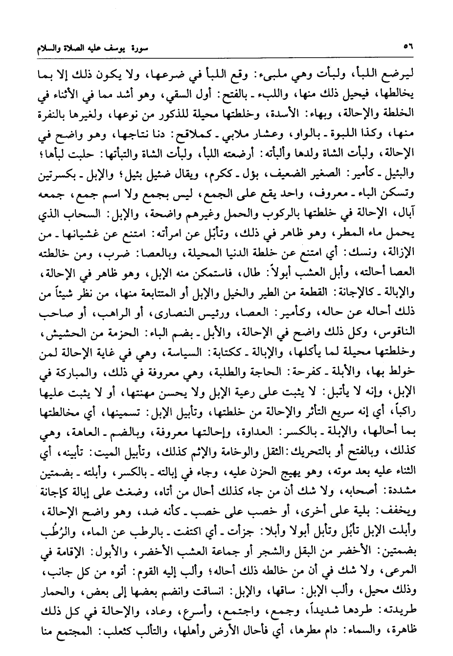 ليرضع اللبأ ، ولبأت وهي ملبئ : وقع اللبأ في ضرعها ، ولا ذلك إلا بما يخالطها ، فيحيل ذلك منها ، واللبء - بالفتح : أول السقي ، وهو أشد مما في الأثناء في الخلطة والإحالة ، وبهاء : الأسدة ، وخلطتها محيلة للذكور من نوعها ، ولغيرها بالنفرة منها ، وكذا اللبوة - بالواو ، وعشار ملابي - كملاقح : دنا نتاتجها ، وهو واضح في الإحالة : ولبأت الشاة ولدها وألبأته : أرضعته اللبأ ، ولبأت الشاة والتبأتها : حلبت لبأها ؛ والبيئل - كأمير : الصغير الضعيف ، بؤل - ككرم ، ويقال ضئيل بئيل ؛ والإبل - بكسرتين وتسكن الباء - معروف ، واحد يقع على الجمع ، ليس بجمع ولا اسم جمع ، جمعه آبال ، الإحالة في خلطتها بالركوب والحمل وغيرهم واضحة ، والإبل : السحاب الذي يحمل ماء المطر ، وهو ظاهر في ذلك ، وتأبّل عن امرأته : امتنع عن غشيانها - من الإزالة ، ونسك : أي امتنع عن خلطة الدنيا المحيلة ، وبالعصا : ضرب ، ومن خالطته العصا أحالته ، وأبل العشب أبولاً : طال ، فاستمكن منه الإبل ، وهو ظاهر في الإحالة ، والإبالة - كالإجانة : القطعة من الطير والخيل والإبل أو المتتابعة منها ، من نظر شيئاً من ذلك أحاله عن حاله ، وكأمير : العصا ، ورئيس النصارى ، أو الراهب ، أو صاحب الناقوس ، وكل ذلك واضح في الإحالة ، والإبل - بالضم الباء : الحزمة من الحشيش ، وخلطتها محيلة لما يأكلها ، والإبالة - ككتابة : السياسة ، وهي في غاية الإحالة لمن خولط بها ، والأبلة - كفرحة : الحاجة والطلبة ، وهي معروفة في ذلك ، والمباركة في الإبل ، وإنه لا يأتبل : لا يثبت على رعية الإبل ولايحسن مهنتها ، أو لا يثبت عليها راكباً ، أي إنه سريع التأثير والإحالة من خلطتها ، وتأبيل الإبل : تسمينها ، أي مخالطتها بما أحالها ، والإبلة - بالكسر : العداوة ، وإحالتها معروفة ، بالضم - العاهة ، وهي كذلك ، وبالفتح أو بالتحريك : الثقل والوخامة والإثم كذلك ، وتأبيل الميت : تأبينه ، أي الثناء عليه بعد موته ، وهو يهيج الحزن عليه ، وجاء في إبالته - بالكسر ، وأبلته - بضمتين مشددة : أصحابه ، ولا شك أن من جاء كذلك أحال من أتاه ، وضغث على إبالة كإجانة ويخفف : بلية على أخرى ، أو خصب على خصب - كأنه ضد ، وهو واضح الإحالة ، وأبلت الإبل تأبُل أبولا وأبلا : جزأت - أي اكتفت - بالرطب عن الماء ، والرُطُب بضمتين : الإخضر منالبقل والشجرأو جماعة العشب الأخضر ، والأبول : الإقامة في المرعى ، ولاشك في أن من خالطه ذلك أحاله ؛ وألب إليه القوم : أتوه من كل جانب ، وذلك محيل ، وألب الإبل : ساقها ، والإبل : انساقت وانضم بعضها إلى بعض ، والحمار طريدته : طردها شديداً ، وجمع ، واجتمع ، وأسرع ، وعاد ، والإحاة في كل ذلك ظاهرة ، والسماء : دام مطرها ، أي فأحال الأرض وأهلها ، والتألب كثعلب : المجتمع منا