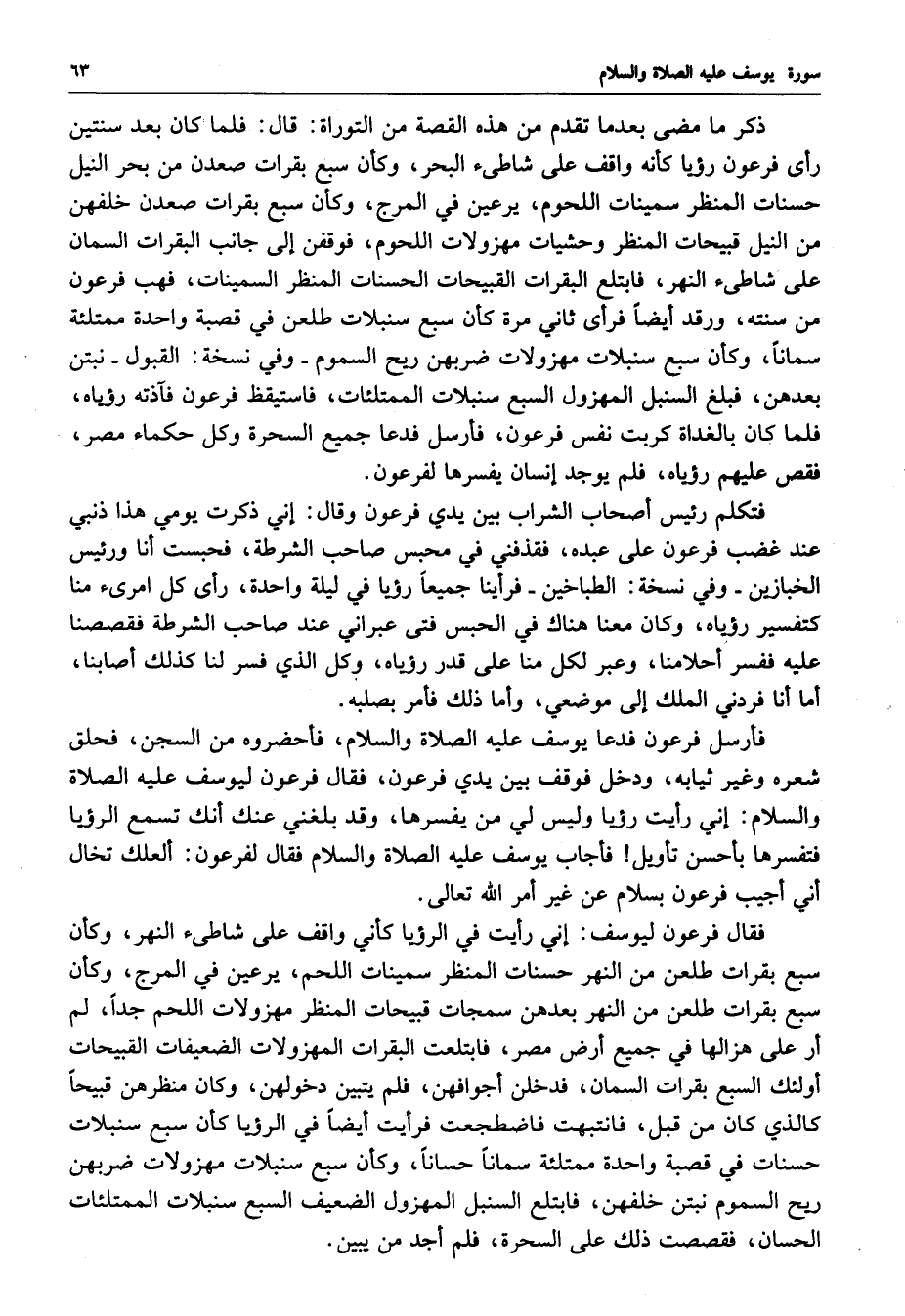 فقال فرعون ليوسف : إني رأيت في الرؤيا كأني واقف على شاطىء النهر ، وكأن سبع بقرات طلعن من النهر حسنات المنظر بعدهن سمجات قبيحات المنظر مهزولات اللحم جداً ، لم أر على هزالها في جميع أرض مصر ، فابتلعت البقرات المهزولات الضعيفات القبيحات أولئك السبع بقرات السمان ، فدخلهن أجوافهن ، فلم يتبين دخولهن ، وكأن منظرهن قبيحاً كالذي كان من قبل ، فانتبهت فاضطجعت فرأيت أيضاً في الرؤيا كأن سبع سنبلات حسنات في قصبة واحدة ممتلئة سماناً حساناً ، وكأن سبع سنبلات مهزولات ضربهن ريح السموم نبتن خلفهن ، فابتلع السنبل المهزول الضعيف السبع سنبلات الممتلئات الحسان ، فقصصت ذلك على السحرة ، فلم أجد من يبين .