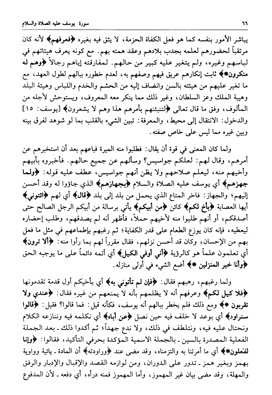 فأخبروه بأبيهم وأخيهم منه ، ليعلم صلاحهم ولا يظن أنهم جواسيس ، عطف عليه قوله : ( ولما جهزهم ) أي يوسف عليه الصلاة والسلام ) بجهازهم ( الذي جاؤوا له وقد أحسن إليهم ؛ والجهاز : فاخر المتاع الذي يحمل من بلد إلى بلد ) قال ) أي لهم ) ائتوني ( أيها العصابة ) بأخ لكم ( كائن ) من أبيكم ( يأتي برسالة من أبيكم الرجل الصالح حتى أصدقكم ، أو أنهم طلبوا منه لأخيهم حملاً ، فأظهر أنه لم يصدقهم ، وطلب إحضاره ليعطيه ، فإنه كان يوزع الطعام على قدر الكفاية ؛ ثم رغبهم بإطماعهم في مثل ما فعل بهم من الإحسان ، وكانقد أحسن نزلهم ، فقال مقرراً لهم بما رأوا منه : ( ألا ترون ) أي تعلمون علماً هو كالرؤية ) أني أوفي الكيل ) أي أتمه دائماً على ما يوجبه الحق ) وأنا خير المنزلين ( أضع الشيء في أولى منازله .