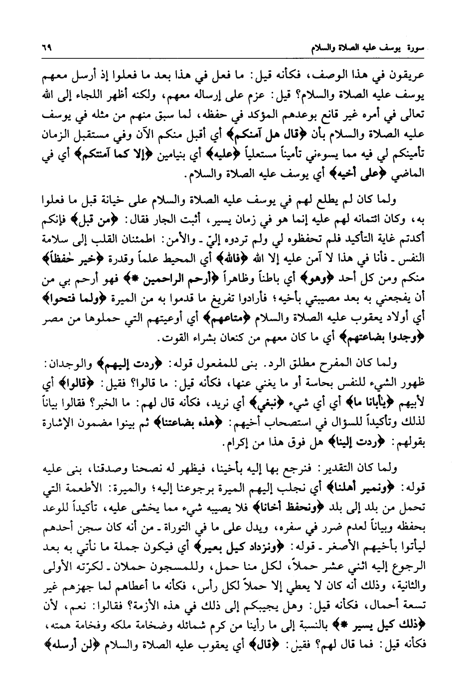 ولما كان التقدير : فنرجع بها إليه بأخينا ، فيظهر له نصحنا وصدقنا ، بنى عليه قوله : ( ونمير أهلنا ) أي نجلب إليهم الميرة برجوعنا إليه ؛ والميرة : الأطعمة التي تحمل من بلد إلى بلد ) ونحفظ أخانا ( فلا يصيبه شيء مما يخشى عليه ، تأكيداً للوعد بحفظه وبياناً لعدم ضرر في سفره ، ويدل على ما في التوراة - من أنه كان سجن أحدهم ليأتوا بأخيهم الأصغر - قوله : ( ونزداد كيل بعير ) أي فيكون جملة ما نأتي به بعد الرجوع إليه اثني عشر حملاً ، لكل منا حمل ، وللمسجون حملان - لكرّته الإولى والثانية ، وذلك أنه كان لا يعطي إلا حملاً لكل رأس ، فكأنه ما أعطاهم لما جهزهم غير تسعة أحمال ، فكأنه قيل : وهل يجيبكم إلى ذلك في هذه الأزمة ؟ فقالوا : نعم ، لأن ) ذلك كيل يسير ( بالنسبة إلى ما رأينا من كرم شمائله وضخامه ملكه وفخامه همته ، فكأنه قيل : فما قال لهم ؟ فقيل : ( قال ) أي يعقوب عليه الصلاة والسلام ) لن أرسله (
