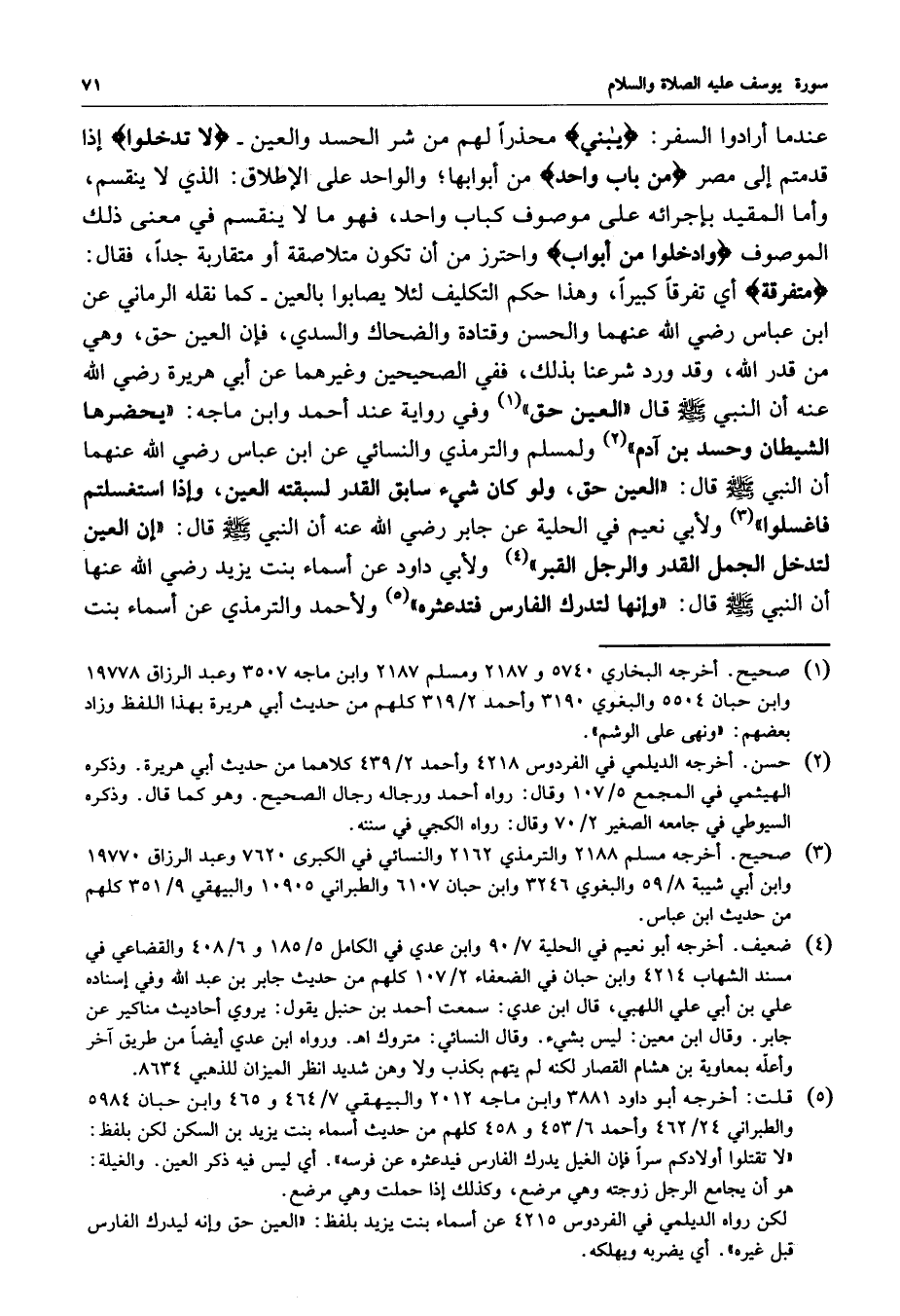 عندما أرادوا السفر : ( يابني ( محذراً لهم من شر الحسد والعين - ) لا تدخلوا ( إذا قدمتم إلى مصر ) من باب واحد ( من أبوابها ؛ والواحد على الإطلاق : الذي لا ينقسم ، وأما المقيد بإجرائه على موصوف كباب واحد ، فهو ما لا ينقسم في معنى ذلك الموصوف ) وادخلوا من أبواب ( واحترز من أن تكون متلاصقة أو متقاربة جداً ، فقال : ( متفرقة ) أي تفريقاً كبيراً ، وهذا حكم التكليف لئلا يصابوا بالعين - كما نقله الرماني عن ابن عباس رضي الله عنهما والحسن وقتادة والضحاك والسدي ، فإن العين حق ، وهي من قدر الله ، وقد ورد شرعنا بذلك ، ففي الصحيحين وغيرهما عن أبي هريرة رضي الله عنه أن النبي ( صلى الله عليه وسلم ) قال ( العين حق ) وفي رواية عند أحمد وابن ماجه : ( يحضرها الشيطان وحسد بن آدم ) ولمسلم والترمذي والنسائي عن ابن عباس رضي الله عنهما أن النبي ( صلى الله عليه وسلم ) قال : ( العين حق ، ولو شيء سابق القدر لسبقته العين ، وإذا استغسلتم فاغسلوا ) ولأبي نعيم في الحيلة عن جابر رضي الله عنه أن النبي قال : ( إن العين لتدخل الجمل القدر والرجل القبر ) ولأبي داود عن أسماء بنت يزيد رضي الله عنها أن النبي ( صلى الله عليه وسلم ) قال : ( وإنما لتدرك الفارس فتدعثره ) ولأحمد والترمذي عن أسماء بنت
