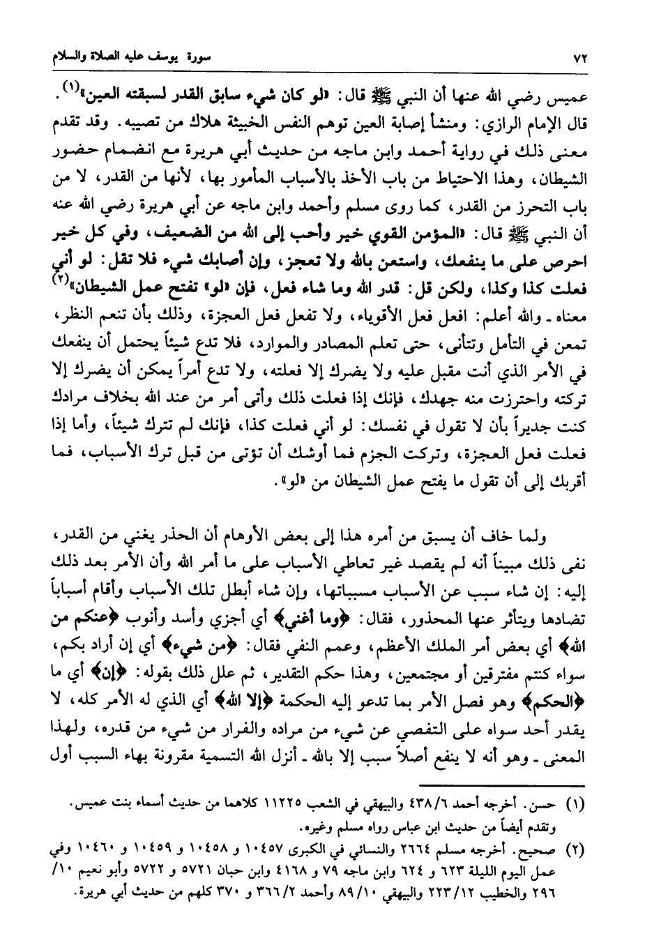 وقد تقدم معنى ذلك في رواية أحمد وابن ماجه من حديث أبي هريرة مع انضمام حضور الشيطان ، وهذا الاحتياط من باب الأخذ بالأسباب المأمور بها ، لأنها من القدر ، لا من من باب التحرز من القدر ، كما روى مسلم وأحمد وابن ماجه عن أبي هريرة رضي الله عنه أن النبي ( صلى الله عليه وسلم ) قال : ( المؤمن القوي خير وأحب إلى الله من الضعيف ، وفي كل خير احرص على ما ينفعك ، واستعن بالله ولا تعجز ، وإن اصابك شيء فلا تقل : لو أني فعلت كذا وكذا ، ولكن قل : قدر الله وما شاء فعل ، فإن ) لو ( تفتح عمل الشيطان ) .