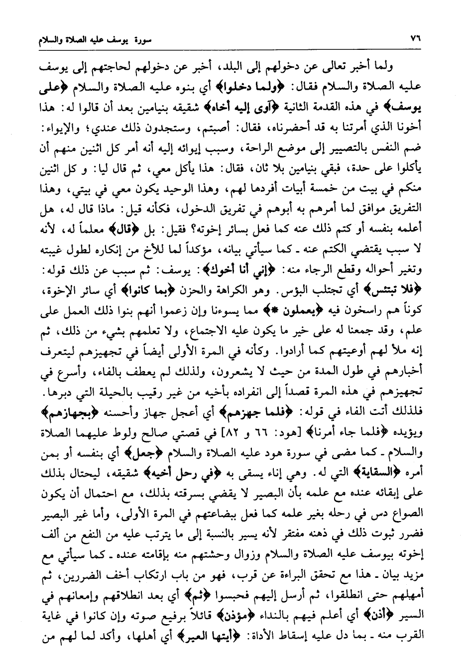 ولما أخبر تعالى عن دخولهم إلى البلد ، أخبرعن دخولهم لحاجتهم إلى يوسف عليه الصلاة والسلام فقاتل : ( ولما دخلوا ) أي بنوه عليه الصلاة والسلام ) على يوسف ( في هذه القدمة الثانية ) آوى إليه أخاه ( شقيقه بنيامين بعد أن قالوا له : هذا أخونا الذي أمرتنا به قد أحضرناه ، فقال : أصبتم ، وستجدون ذلك عندي ؛ والإيواء : ضم النفس بالتصيير إلى موضع الراحة ، وسبب إيوائه إليه أنه أمر كل اثنين منهم أن يأكلوا على حدة ، فبقي بنيامين بلا ثان ، فقال : هذا يأكل معي ، ثم قال ليا : وكل اثنين منكم في بيت من خمسة أبيات أفردها لهم ، وهذا الوحيد يكون معي في بيتي ، وهذا التفريق موافق لما أمرهم به أبوهم في تفريق الدخول ، فكأنه قيل : ماذا قال له ، هل أعلمه بنفسه أو كتم ذلك عنه كما فعل بسائر إخوته ؟ فقيل : بل ) قال ( معلماً له ، لأنه لا سبب يقتضي الكتم عنه - كما سيأتي بيانه ، مؤكداً لما للأخ من إنكاره لطول غيبته وتغير أحواله وقطع الرجاء منه : ( إني أنا أخوك ( يوسف : ثم سبب عن ذلك قوله : ( فلا تبتئس ) أي تجتلب البؤس .